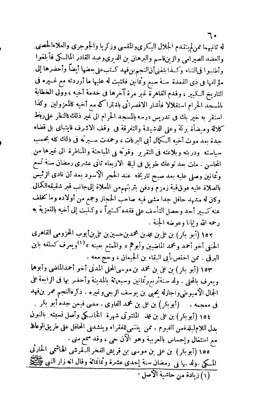 لَهُ ثَانِيهمَا مِمَّن لم يتَقَدَّم الْجلَال الْبكْرِيّ والمقسي وزَكَرِيا والجوجري والْعَلَاء الحصني والعضد الصيرامي والزين قَاسم والبرهان بن الديري وَعبد الْقَادِر الْمَالِكِي فأبلغوا وأطنبوا فِي الثَّنَاء وَكَذَا بَلغنِي أَن النَّجْم بن فَهد كتب على بَعْضهَا أَيْضا وأحضرها إِلَى مؤلفها فِي ذِي الْقعدَة سنة سبع وَثَمَانِينَ فَكتبت لَهُ عَلَيْهَا مَا أوردته مَعَ غَيره فِي التَّارِيخ الْكَبِير وَقدم الْقَاهِرَة غير مرّة آخرهَا فِي خدمَة أَخِيه وَولي الخطابة بِالْمَسْجِدِ الْحَرَام اسْتِقْلَالا فَأَشَارَ الأقصرائي باشتراكه مَعَ أَخِيه كالمعزولين وَكَذَا اسْتَقر بِهِ خير بك فِي تدريس درسه بِالْمَسْجِدِ الْحَرَام إِلَى غير ذَلِك كالنظر على رِبَاط كَلَالَة وميضأة بركَة وعَلى الدشيشة والتفرقة فِي وقف الْأَشْرَف قايتباي بل قَضَاء جدة بعد موت أَخِيه الْكَمَال أبي البركات وحمدت سيرته فِي ذَلِك كُله بِحَسب سياسته ودربته وبلاعته فِي التَّقْرِير وقوته فِي المباحثة والمناظرة إِلَى غَيرهَا من المحاسن مَاتَ بعد توعك طَوِيل فِي لَيْلَة الْأَرْبَعَاء ثَانِي عشرى رَمَضَان سنة تسع وَثَمَانِينَ وَصلي عَلَيْهِ بعد صبح تَارِيخه عِنْد الْحجر الْأسود بعد أَن نَادَى الرئيس بِالصَّلَاةِ عَلَيْهِ فَوق قبَّة زَمْزَم وَدفن بتربتهم من المعلاة إِلَى جَانب قبر شقيقه الكمالي وَكَانَ لَهُ مشْهد حافل جدا مَشى فِيهِ صَاحب الْحجاز وَجمع من أَوْلَاده وَمَا تخلف عَنهُ كَبِير أحد وَحصل التأسف على فَقده كثيرا وكتبت إِلَى أَخِيه بالتعزية بِهِ رَحمَه الله وإيانا وعوضه الْجنَّة 15 (أَبُو بكر) بن عَليّ بن مُحَمَّد بن مُحَمَّد بن حُسَيْن بن عَليّ بن أَيُّوب المَخْزُومِي القاهري الْحَنَفِيّ أَخُو أَحْمد وَمُحَمّد الماضيين وأبوهم (والممتع بِعَيْنِه) وَيعرف كسلفه بِابْن البرقي مِمَّن اخْتصَّ بِأبي الْبَقَاء بن الجيعان وَحج مَعَه 153 (أَبُو بكر) بن عَليّ بن مُحَمَّد بن مُوسَى الْمحلي الْمدنِي أَخُو أَحْمد الْمَاضِي وأبوهما وَيعرف بالمحلى ولد سنة أَربع وَثَمَانِينَ وَسَبْعمائة بِالْمَدِينَةِ وأحضر بهَا فِي الرَّابِعَة على الْجمال الأميوطي وَأَجَازَ لَهُ يحيى بن يُوسُف الربعِي وَغَيره ذكره النَّجْم عمر بن فَهد فِي مُعْجَمه (أَبُو بكر) بن عَليّ بن مُحَمَّد الفاوي مضى فِيمَن جده أَبُو بكر 154 (أَبُو بكر) بن عَليّ بن مُحَمَّد الملتوتي شهرة الخانكي وأصل نسبته بالنُّون بدل اللَّام لبلدة من الفيوم مِمَّن ينتمي للْفُقَرَاء وينشد فِي المحافل على طَرِيق الوعاظ مَعَ اشْتِغَال وإحساس بِالْعَرَبِيَّةِ وَهُوَ الْآن حَيّ وَقد سمع مني 155 (أَبُو بكر) بن عَليّ بن مُوسَى بن قُرَيْش الْفَخر الْقرشِي الْهَاشِمِي الْحَارِثِيّ الْمَكِّيّ ولد بهَا فِي رَمَضَان سنة إِحْدَى عشرَة وَثَمَانمِائَة وَقَالَ أَنه زار النَّبِي