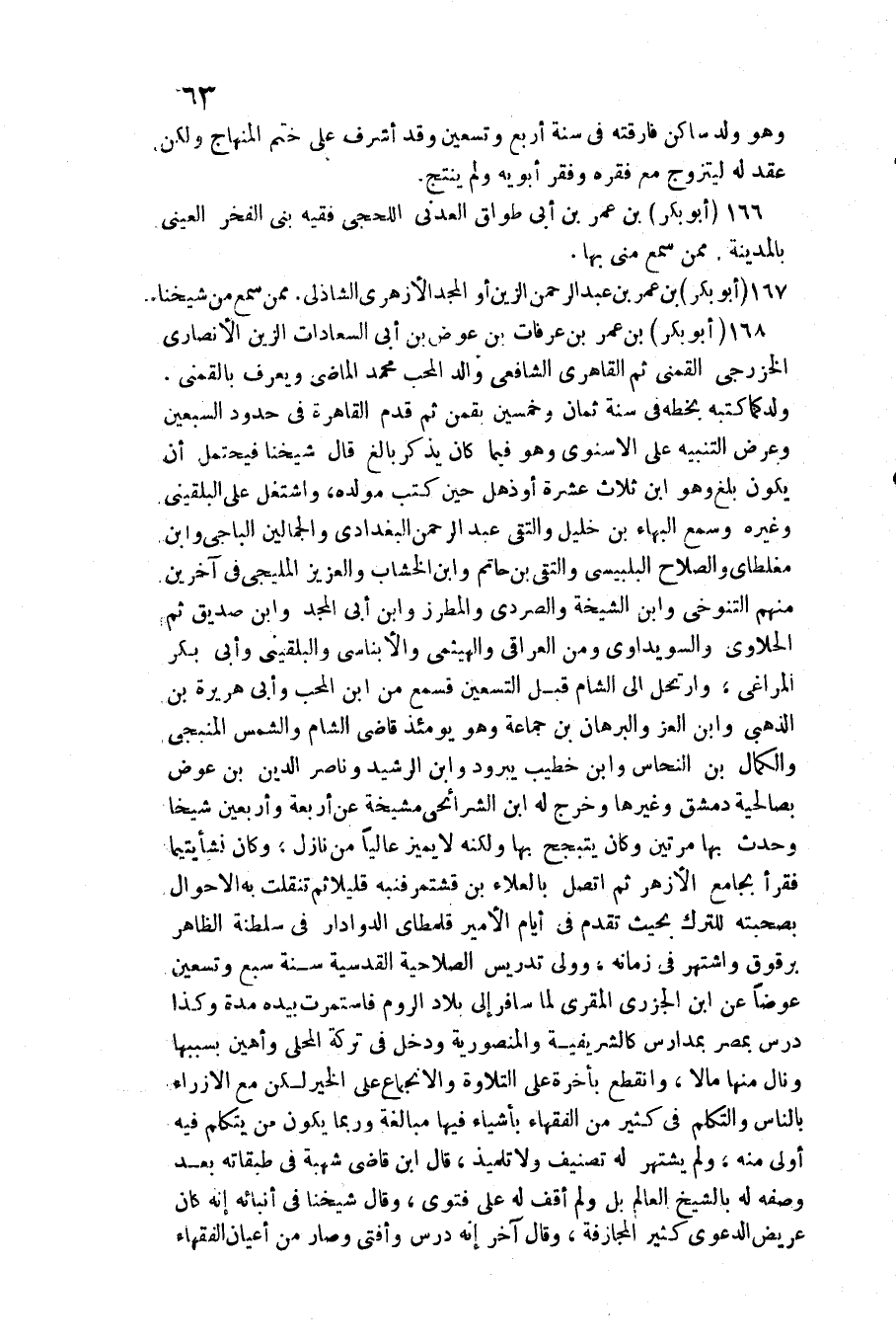 وَهُوَ ولد سَاكن فارقته فِي سنة أَربع وَتِسْعين وَقد أشرف على ختم الْمِنْهَاج وَلَكِن عقد لَهُ ليتزوج مَعَ فقره وفقر أَبَوَيْهِ وَلم ينْتج 166 (أَبُو بكر) بن عمر بن أبي طواق الْعَدنِي اللحجي فَقِيه بني الْفَخر الْعَيْنِيّ بِالْمَدِينَةِ مِمَّن سمع مني بهَا 167 (ابو بكر) بن عمر بن عبد الرَّحْمَن الزين أَو الْمجد الْأَزْهَرِي الشاذلي مِمَّن سمع من شَيخنَا 16 {أَبُو بكر) بن عمر بن عَرَفَات بن عوض بن أبي السعادات الزين الْأنْصَارِيّ الخزرجي القمني ثمَّ القاهري الشَّافِعِي وَالِد الْمُحب مُحَمَّد الْمَاضِي وَيعرف بالقمني ولد كَمَا كتبه بِخَطِّهِ فِي سنة ثَمَان وَخمسين بقمن ثمَّ قدم الْقَاهِرَة فِي حُدُود السّبْعين وَعرض التَّنْبِيه على الأسنوي وَهُوَ فِيمَا كَانَ يذكر بَالغ قَالَ شَيخنَا فَيحْتَمل أَن يكون بلغ وَهُوَ ابْن ثَلَاث عشرَة أَو ذهل حِين كتب مولده واشتغل على البُلْقِينِيّ وَغَيره وَسمع الْبَهَاء بن خَلِيل والتقي عبد الرَّحْمَن الْبَغْدَادِيّ والجمالين الْبَاجِيّ وَابْن مغلطاي وَالصَّلَاح البلبيسي والتقي بن حَاتِم وَابْن الخشاب والعزيز المليجي فِي آخَرين مِنْهُم التنوخي وَابْن الشيخة والصردي والمطرز وَابْن أبي الْمجد وَابْن صديق ثمَّ الحلاوي والسويداوي وَمن الْعِرَاقِيّ والهيثمي والأبناسي والبلقيني وَأبي بكر المراغي وارتحل إِلَى الشَّام قبل التسعين فَسمع من ابْن الْمُحب وَأبي هُرَيْرَة بن الذَّهَبِيّ وَابْن الْعِزّ الْبُرْهَان بن جمَاعَة وَهُوَ يَوْمئِذٍ قَاضِي الشَّام وَالشَّمْس المنبجي والكمال بن النّحاس وَابْن خطيب يبرود وَابْن الرشيد وناصر الدّين بن عوض بصالحية دمشق وَغَيرهَا وَخرج لَهُ ابْن الشرائحي مشيخة عَن أَرْبَعَة وَأَرْبَعين شَيخا وَحدث بهَا مرَّتَيْنِ وَكَانَ يتبجح بهَا وَلكنه لَا يُمَيّز عَالِيا من نَازل وَكَانَ نَشأ يَتِيما فَقَرَأَ بِجَامِع الْأَزْهَر ثمَّ اتَّصل بِالْعَلَاءِ بن قشتمر فنبه قَلِيلا ثمَّ تنقلت بِهِ الْأَحْوَال بِصُحْبَتِهِ للترك بِحَيْثُ تقدم فِي أَيَّام الْأَمِير قلمطاي الدوادار فِي سلطنة الظَّاهِر برقوق واشتهر فِي زَمَانه وَولي تدريس الصلاحية القدسية سنة سبع وَتِسْعين عوضا عَن ابْن الْجَزرِي الْمقري لما سَافر إِلَى بِلَاد الرّوم فاستمرت بِيَدِهِ مُدَّة وَكَذَا درس بِمصْر بمدارس كالشريفية والمنصورية وَدخل فِي تَرِكَة الْمحلى وأهين بِسَبَبِهَا ونال مِنْهَا مَالا وَانْقطع بِأخرَة على التِّلَاوَة والانجماع على الْخَيْر لَكِن مَعَ الإزراء بِالنَّاسِ والتكلم فِي كثير من الْفُقَهَاء بأَشْيَاء فِيهَا مُبَالغَة وَرُبمَا يكون من يتَكَلَّم فِيهِ أولى مِنْهُ وَلم يشْتَهر لَهُ تصنيف وَلَا تلميذ قَالَ ابْن قَاضِي شُهْبَة فِي طبقاته بعد وَصفه لَهُ بالشيخ الْعَالم بل وَلم أَقف لَهُ على فَتْوَى وَقَالَ شَيخنَا فِي أنبائه إِنَّه كَانَ عريض الدَّعْوَى كثير المجازفة وَقَالَ آخر إِنَّه درس وَأفْتى وَصَارَ من أَعْيَان الْفُقَهَاء