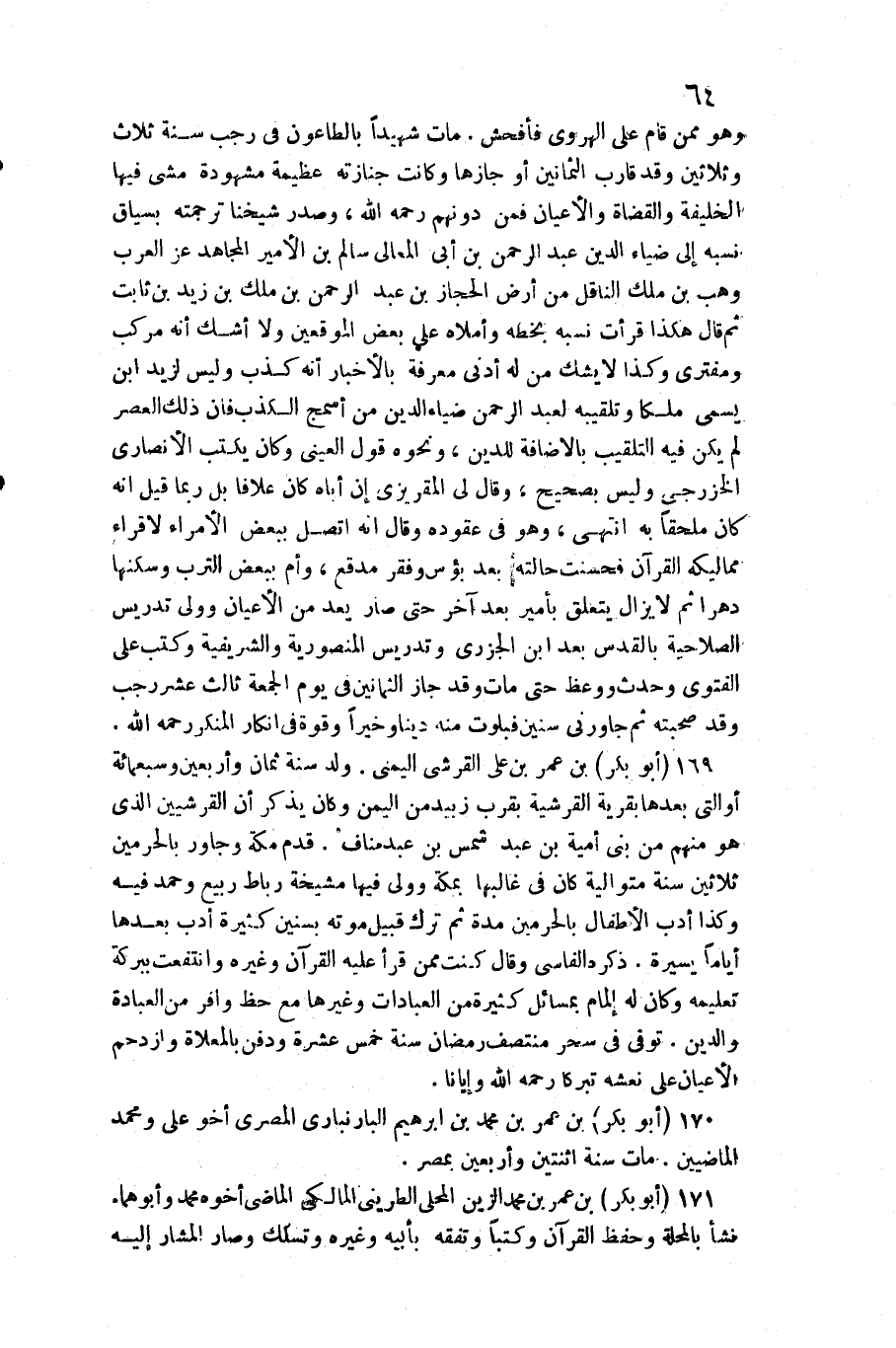 وَهُوَ مِمَّن قَامَ على الْهَرَوِيّ فأفحش مَاتَ شَهِيدا بالطاعون فِي رَجَب سنة ثَلَاث وَثَلَاثِينَ وَقد قَارب الثَّمَانِينَ أَو جازها وَكَانَت جنَازَته عَظِيمَة مَشْهُودَة مَشى فِيهَا الْخَلِيفَة والقضاة والأعيان فَمن دونهم رَحمَه الله وَصدر شَيخنَا تَرْجَمته بسياق نسبه إِلَى ضِيَاء الدّين عبد الرَّحْمَن بن أبي الْمَعَالِي سَالم بن الْأَمِير الْمُجَاهِد عز الْعَرَب وهب بن ملك النَّاقِل من أَرض الْحجاز بن عبد الرَّحْمَن بن ملك بن زيد بن ثَابت ثمَّ قَالَ هَكَذَا قَرَأت نسبه بِخَطِّهِ وأملاه على بعض الموقعين وَلَا أَشك أَنه مركب ومفترى وَكَذَا لَا يشك من لَهُ أدنى معرفَة بالأخبار أَنه كذب وَلَيْسَ لزيد ابْن يُسمى ملكا وتلقيبه لعبد الرَّحْمَن ضِيَاء الدّين من أسمج الْكَذِب فَإِن ذَلِك الْعَصْر لم يكن فِي التلقيب بِالْإِضَافَة للدّين وَنَحْوه قَول الْعَيْنِيّ وَكَانَ يكْتب الْأنْصَارِيّ الخزرجي وَلَيْسَ بِصَحِيح وَقَالَ لي المقريزي أَن أَبَاهُ كَانَ علافا بل رُبمَا قيل أَنه كَانَ مُلْحقًا بِهِ انْتهى وَهُوَ فِي عقوده وَقَالَ إِنَّه اتَّصل بِبَعْض الْأُمَرَاء لإقراء مماليكه الْقُرْآن فحسنت حَالَته بعد بؤس وفقر مدقع وَأم بِبَعْض الترب وسكنها دهرا ثمَّ لَا يزَال يتَعَلَّق بأمير بعد آخر حَتَّى صَار يعد من الْأَعْيَان وَولي تدريس الصلاحية بالقدس بعد ابْن الْجَزرِي وتدريس المنصورية والشريفية وَكتب على الْفَتْوَى وَحدث وَوعظ حَتَّى مَاتَ وَقد جَازَ الثَّمَانِينَ فِي يَوْم الْجُمُعَة ثَالِث عشر رَجَب وَقد صحبته ثمَّ جاورني سِنِين فبلوت مِنْهُ دينا وَخيرا وَقُوَّة فِي إِنْكَار الْمُنكر رَحمَه الله 169 (أَبُو بكر) بن عمر بن عَليّ الْقرشِي اليمني ولد سنة ثَمَان وَأَرْبَعين وَسَبْعمائة أَو الَّتِي بعْدهَا بقرية القرشية بِقرب زبيد من الْيمن وَكَانَ يذكر أَن القرشيين الَّذِي هُوَ مِنْهُم من بني أُميَّة بن عبد شمس بن عبد منَاف قدم مَكَّة وجاور بالحرمين ثَلَاثِينَ سنة مُتَوَالِيَة كَانَ فِي غالبها بِمَكَّة وَولي فِيهَا مشيخة رِبَاط ربيع وَحمد فِيهِ وَكَذَا أدب الْأَطْفَال بالحرمين مُدَّة ثمَّ ترك قبيل مَوته بسنين كَثِيرَة أدب بعْدهَا أَيَّامًا يسيرَة ذكره الفاسي وَقَالَ كنت مِمَّن قَرَأَ عَلَيْهِ الْقُرْآن وَغَيره وانتفعت ببركة تَعْلِيمه وَكَانَ لَهُ إِلْمَام بمسائل كَثِيرَة من الْعِبَادَات وَغَيرهَا مَعَ حَظّ وافر من الْعِبَادَة وَالدّين توفّي فِي سحر منتصف رَمَضَان سنة خمس عشرَة وَدفن بالمعلاة وازدحم الْأَعْيَان على نعشه تبركا رَحمَه الله وإيانا 170 (أَبُو بكر) بن عمر بن مُحَمَّد بن إِبْرَاهِيم البارنباري الْمصْرِيّ أَخُو عَليّ وَمُحَمّد الماضيين مَاتَ سنة اثْنَتَيْنِ واربعين بِمصْر 17 (أَبُو بكر) بن عمر بن مُحَمَّد الزين الْمحلى الطريني الْمَالِكِي الْمَاضِي أَخُوهُ مُحَمَّد وأبوهما نَشأ بالمحلة وَحفظ الْقُرْآن وكتبا وتفقه بِأَبِيهِ وَغَيره وتسلك وَصَارَ الْمشَار إِلَيْهِ