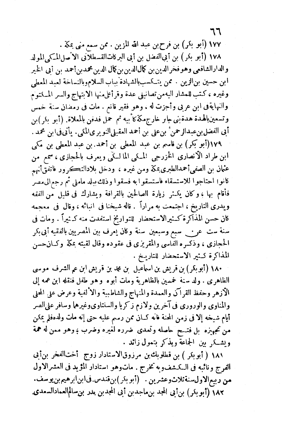 177 - (أَبُو بكر) بن فَرح بن عبد الله المزين مِمَّن سمع مني بِمَكَّة 17 {أَبُو بكر) بن أبي الْفضل بن أبي البركات الْقُسْطَلَانِيّ الأَصْل الْمَكِّيّ المولد وَالدَّار الشَّافِعِي وَهُوَ فَخر الدّين بن كَمَال الدّين بن كَمَال الدّين مُحَمَّد بن أَحْمد بن أبي الْخَيْر بن حُسَيْن بن الزين مِمَّن يتكسب بِالشَّهَادَةِ بِبَاب السَّلَام وبالنساخة لعبد الْمُعْطِي وَغَيره كتب للمشار إِلَيْهِ من تصانيفي عدَّة وَقَرَأَ عَليّ مِنْهَا الابتهاج والسر المكتوم وَالنِّهَايَة فِي ابْن الْعَرَبِيّ وأجزت لَهُ وَهُوَ فَقير قَانِع مَاتَ فِي رَمَضَان سنة خمس وَتِسْعين بِالْهَدةِ هدة بني جَابر خَارج مَكَّة كأبيه ثمَّ حمل فَدفن بالمعلاة (أَبُو بكر) بن أبي الْفضل بن عبد الرَّحْمَن بن عَليّ بن أَحْمد الْعقيلِيّ النويري الْمَكِّيّ يَأْتِي فِي ابْن مُحَمَّد 179 (أَبُو بكر) بن قَاسم بن عبد الْمُعْطِي بن أَحْمد بن عبد الْمُعْطِي بن مكي بن طراد الْأنْصَارِيّ الخزرجي الْمَكِّيّ الْمَالِكِي وَيعرف بالحجازي سمع من عُثْمَان بن الصفى أَحْمد الطَّبَرِيّ بِمَكَّة وَمن غَيره وَدخل بِلَاد التكرور فاتفق أَنهم كَانُوا احتاجوا للاستسقاء فاستسقوا بِهِ فسقوا وَذَلِكَ بِبَلَد ماملى ثمَّ رَجَعَ إِلَى مصر فَأَقَامَ بهَا وَكَانَ يكثر زِيَارَة الصَّالِحين بالقرافة ويشارك فِي قَلِيل من الْفِقْه ويدري التَّارِيخ اجْتمعت بِهِ مرَارًا قَالَ شَيخنَا فِي أنبائه وَقَالَ فِي مُعْجَمه كَانَ حسن المذاكرة كثير الاستحضار للتواريخ اسْتَفَدْت مِنْهُ كثيرا وَمَات فِي سنة سِتّ عَن سبع وَسبعين سنة وَكَانَ يعرف بَين المصريين بالفقيه أبي بكر الْحِجَازِي وَذكره الفاسي والمقريزي فِي عقوده وَقَالَ لَقيته بِمَكَّة وَكَانَ حسن المذاكرة كثير الاستحضار للتاريخ 180 (أَبُو بكر) بن قُرَيْش بن اسماعيل بن مُحَمَّد بن قُرَيْش ابْن عَم الشّرف مُوسَى الظَّاهِرِيّ ولد سنة خمسين بالظاهرية وَمَات أَبوهُ وَهُوَ طِفْل فنقله ابْن عَمه إِلَى الْأَزْهَر وَحفظ الْقُرْآن والعمدة والمنهاج والشاطبية والألفية وَعرض على الْمحلي والمناوي والوروري فِي آخَرين ولازم زَكَرِيَّا والسنتاوي وَغَيرهمَا وسافر على الصر أَيَّام شَيْخه إِلَّا فِي زمن المحنة فَإِنَّهُ كَانَ مِمَّن رسم عَلَيْهِ حَتَّى إِنَّه مَاتَ وَلَده فَلم يُمكن من تَجْهِيزه بل فتح حَاصله وتعدى ضَرَره لغيره وَضرب وَهُوَ مِمَّن لَهُ همة ويشكر بَين الْجَمَاعَة وَيذكر بتمول زَائِد 18 (أَبُو بكر) بن قطلوبك بن مَرْزُوق الاستادار زوج أُخْت الْفَخر بن أبي الْفرج ونائبه فِي الْكَشْف وَبِه تخرج مَاتَ وَهُوَ استادار الْمُؤَيد فِي الْعشْر الأول من ربيع الأول سنة ثَلَاث وَعشْرين (أَبُو بكر) بن قندس فِي ابْن إِبْرَاهِيم بن يُوسُف 18 (أَبُو بكر) بن أبي الْمجد بن ماجد بن أبي الْمجد بن بدر بن سَالم الْعِمَاد السَّعْدِيّ