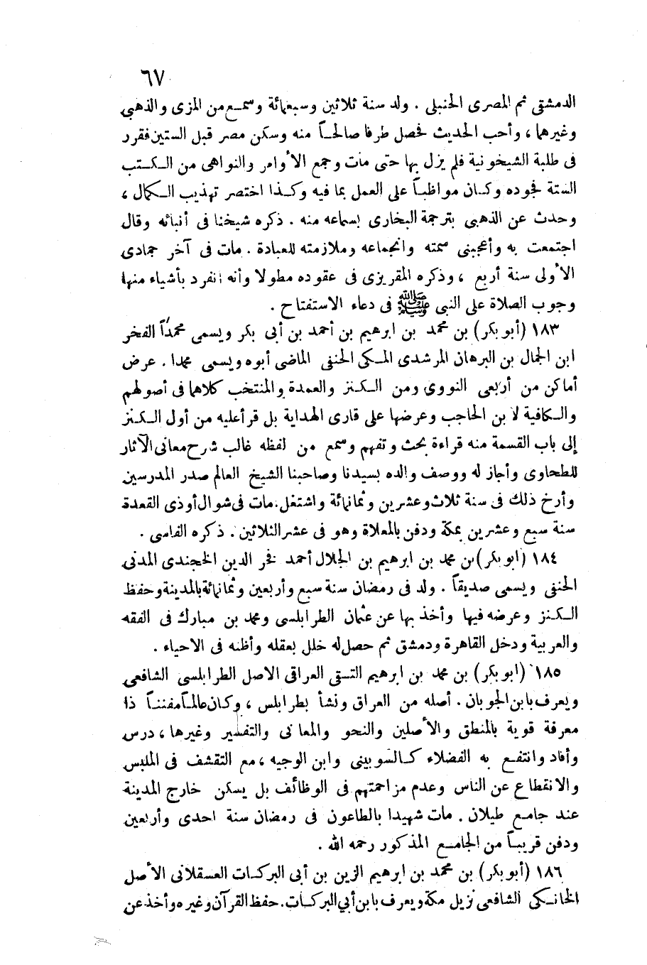 فِي دُعَاء الاستفتاح 183 (أَبُو بكر) بن مُحَمَّد بن إِبْرَاهِيم بن أَحْمد بن أبي بكر وَيُسمى مُحَمَّدًا الْفَخر بن جمال بن الْبُرْهَان المرشدي الْمَكِّيّ الْحَنَفِيّ الْمَاضِي أَبوهُ وَيُسمى مُحَمَّدًا عرض أَمَاكِن من أربعي النَّوَوِيّ وَمن الْكَنْز والعمدة والمنتخب كِلَاهُمَا فِي أصولهم والكافية لِابْنِ الْحَاجِب وعرضها على قاري الْهِدَايَة بل قَرَأَ عَلَيْهِ من أول الْكَنْز إِلَى بَاب الْقِسْمَة مِنْهُ قِرَاءَة بحث وتفهم وَسمع من لَفظه غَالب شرح مَعَاني الْآثَار للطحاوي وَأَجَازَ لَهُ وَوصف وَالِده بسيدنا وصاحبنا الشَّيْخ الْعَالم صدر المدرسين وأرخ ذَلِك فِي سنة ثَلَاث وَعشْرين وَثَمَانمِائَة واشتغل مَاتَ فِي شَوَّال أَو ذِي الْقعدَة سنة سبع وَعشْرين بِمَكَّة وَدفن بالمعلاة وَهُوَ فِي عشر الثَّلَاثِينَ ذكره الفاسي 184 (أَبُو بكر) بن مُحَمَّد بن إِبْرَاهِيم بن الْجلَال أَحْمد فَخر الدّين الخجندي الْمدنِي الْحَنَفِيّ وَيُسمى صديقا ولد فِي رَمَضَان سنة سبع وَأَرْبَعين وَثَمَانمِائَة بِالْمَدِينَةِ وَحفظ الْكَنْز وَعرضه فِيهَا وَأخذ بهَا عَن عُثْمَان الطرابلسي وَمُحَمّد بن مبارك فِي الْفِقْه والعربية وَدخل الْقَاهِرَة ودمشق ثمَّ حصل لَهُ خلل بعقله وَأَظنهُ فِي الْأَحْيَاء 185 (أَبُو بكر) بن مُحَمَّد بن إِبْرَاهِيم التقي الْعِرَاقِيّ الأَصْل الطرابلسي الشَّافِعِي وَيعرف بِابْن الجوبان أَصله من الْعرَاق وَنَشَأ بطرابلس وَكَانَ عَالما مفننا ذَا معرفَة قَوِيَّة بالْمَنْطق والأصلين والنحو والمعاني وَالتَّفْسِير وَغَيرهَا درس وَأفَاد وانتفع بِهِ الْفُضَلَاء كالسوبيني وَابْن الْوَجِيه مَعَ التقشف فِي الملبس والانقطاع عَن النَّاس وَعدم مزاحمتهم فِي الْوَظَائِف بل يسكن خَارج الْمَدِينَة عِنْد جَامع طيلان مَاتَ شَهِيدا بالطاعون فِي رَمَضَان سنة إِحْدَى وَأَرْبَعين وَدفن قَرِيبا من الْجَامِع الْمَذْكُور رَحمَه الله 186 (أَبُو بكر) بن مُحَمَّد بن إِبْرَاهِيم الزين بن أبي البركات الْعَسْقَلَانِي الأَصْل الخانكي الشَّافِعِي نزيل مَكَّة وَيعرف بِابْن أبي البركات حفظ الْقُرْآن وَغَيره وَأخذ عَن