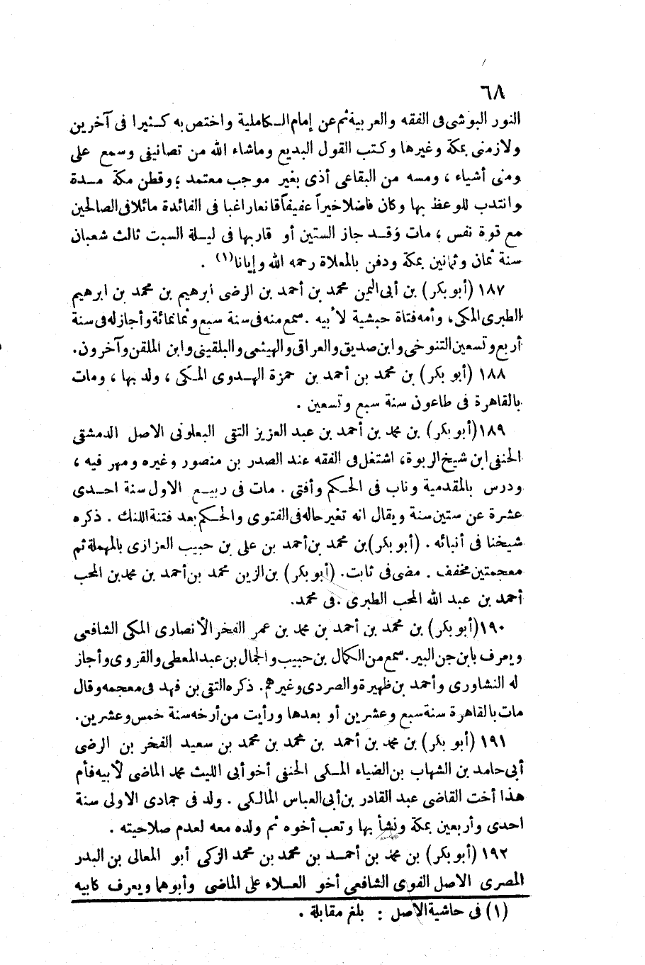 النُّور البوشي فِي الْفِقْه والعربية ثمَّ عَن إِمَام الكاملية واختص بِهِ كثيرا فِي آخَرين ولازمني بِمَكَّة وَغَيرهَا وَكتب القَوْل البديع وَمَا شَاءَ الله من تصانيفي وَسمع عَليّ ومني أَشْيَاء ومسه من البقاعي أَذَى بِغَيْر مُوجب مُعْتَمد وقطن مَكَّة مُدَّة وانتدب للوعظ بهَا وَكَانَ فَاضلا خيرا عفيفا قانعا رَاغِبًا فِي الْفَائِدَة مائلا فِي الصَّالِحين مَعَ قُوَّة نفس مَاتَ وَقد جَازَ السِّتين أَو قاربها فِي لَيْلَة السبت ثَالِث شعْبَان سنة ثَمَان وَثَمَانِينَ بِمَكَّة وَدفن بالمعلاة رَحمَه الله وإيانا 187 (أَبُو بكر) بن أبي الْيمن مُحَمَّد بن أَحْمد بن الرضى إِبْرَاهِيم بن مُحَمَّد بن إِبْرَاهِيم الطَّبَرِيّ الْمَكِّيّ وَأمه فتاة حبشية لِأَبِيهِ سمع مِنْهُ فِي سنة سبع وَثَمَانمِائَة وَأَجَازَ لَهُ فِي سنة أَربع وَتِسْعين التنوخي وَابْن صديق والعراقي والهيثمي والبلقيني وَابْن الملقن وَآخَرُونَ 18 {أَبُو بكر) بن مُحَمَّد بن أَحْمد بن حَمْزَة الهدوي الْمَكِّيّ ولد بهَا وَمَات بِالْقَاهِرَةِ فِي طاعون سنة سبع وَتِسْعين 189 (أَبُو بكر) بن مُحَمَّد بن أَحْمد بن عبد الْعَزِيز التقي البعلوني الأَصْل الدِّمَشْقِي الْحَنَفِيّ ابْن شيخ الربوة اشْتغل فِي الْفِقْه عِنْد الصَّدْر بن مَنْصُور وَغَيره وَمهر فِيهِ ودرس بالمقدمية وناب فِي الحكم وَأفْتى مَاتَ فِي ربيع الأول سنة إِحْدَى عشرَة عَن سِتِّينَ سنة وَيُقَال أَنه تغير حَاله فِي الْفَتْوَى وَالْحكم بعد فتْنَة اللنك ذكره شَيخنَا فِي أنبائه أَبُو بكر بن مُحَمَّد بن أَحْمد بن عَليّ بن حبيب العزازي بِالْمُهْمَلَةِ ثمَّ معجمتين مخفف مضى فِي ثَابت (أَبُو بكر) بن الزين مُحَمَّد بن أَحْمد بن مُحَمَّد بن الْمُحب أَحْمد بن عبد الله الْمُحب الطَّبَرِيّ فِي مُحَمَّد 190 (ابو بكر) بن مُحَمَّد بن أَحْمد بن مُحَمَّد بن عمر الْفَخر الْأنْصَارِيّ الْمَكِّيّ الشَّافِعِي وَيعرف بِابْن جن البير سمع من الْكَمَال بن حبيب وَالْجمال بن عبد الْمُعْطِي والقروي وَأَجَازَ لَهُ النشاوري وَأحمد بن ظهيرة والصردي وَغَيرهم ذكره التقي بن فَهد فِي مُعْجَمه وَقَالَ مَاتَ بِالْقَاهِرَةِ سنة سبع وَعشْرين أَو بعْدهَا وَرَأَيْت من أرخه سنة خمس وَعشْرين 19 (أَبُو بكر) بن مُحَمَّد بن أَحْمد بن مُحَمَّد بن مُحَمَّد بن سعيد الْفَخر بن الرضى أبي حَامِد بن الشهَاب بن الضياء الْمَكِّيّ الْحَنَفِيّ أَخُو أبي اللَّيْث مُحَمَّد الْمَاضِي لِأَبِيهِ فَأم هَذَا أُخْت القَاضِي عبد الْقَادِر بن أبي الْعَبَّاس الْمَالِكِي ولد فِي جُمَادَى الأولى سنة إِحْدَى وَأَرْبَعين بِمَكَّة وَنَشَأ بهَا وتعب أَخُوهُ ثمَّ وَلَده مَعَه لعدم صلاحيته 19 (أَبُو بكر) بن مُحَمَّد بن أَحْمد بن مُحَمَّد بن مُحَمَّد الزكي أَبُو الْمَعَالِي بن الْبَدْر الْمصْرِيّ الأَصْل الفوي الشَّافِعِي أَخُو الْعَلَاء على الْمَاضِي وأبوهما وَيعرف كأبيه