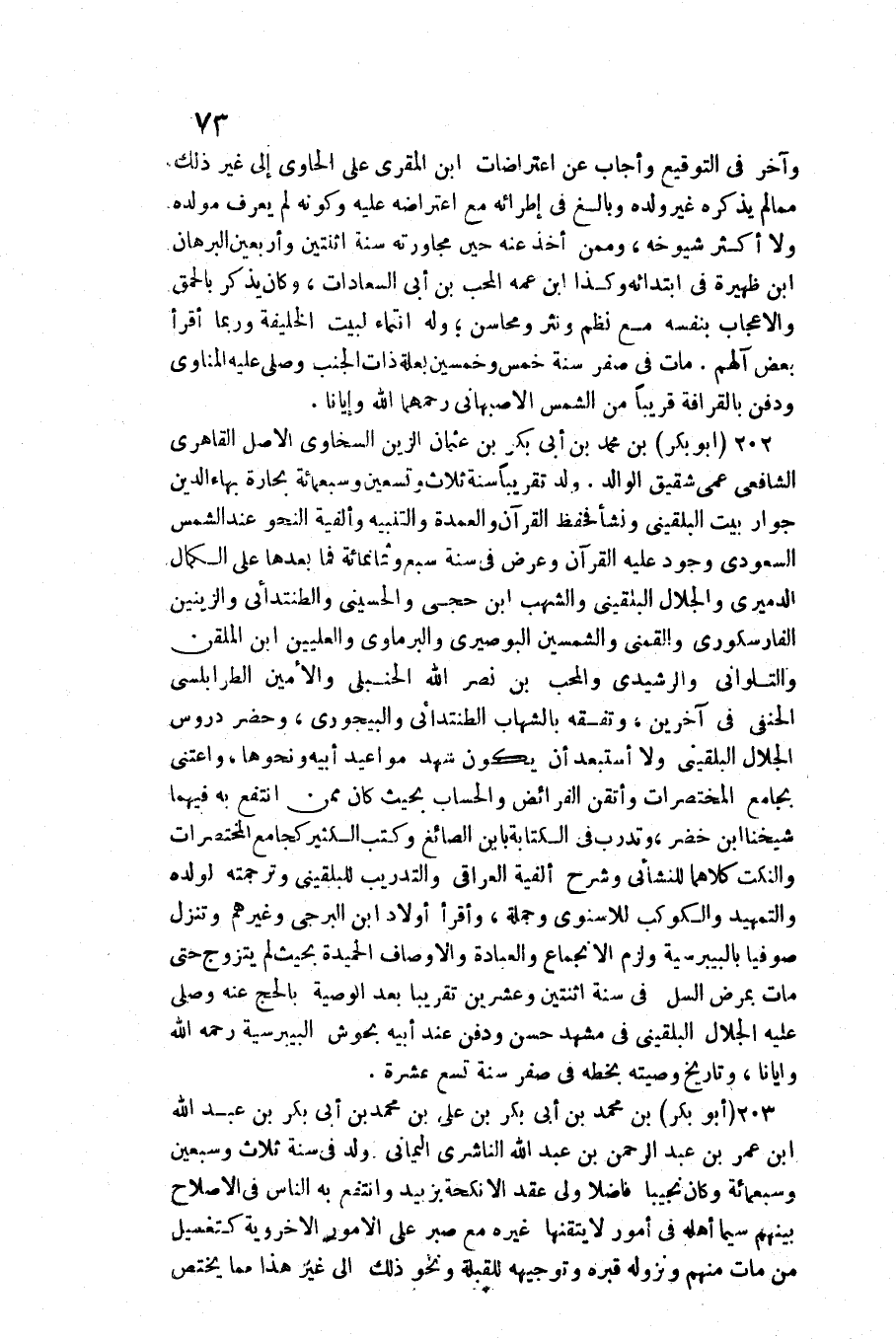 وَآخر فِي التوقيع وَأجَاب عَن اعتراضات ابْن الْمقري على الْحَاوِي إِلَى غير ذَلِك مِمَّا لم يذكرهُ غير وَلَده وَبَالغ فِي إطرائه مَعَ اعتراضه عَلَيْهِ وَكَونه لم يعرف مولده وَلَا أَكثر شُيُوخه وَمِمَّنْ أَخذ عَنهُ حِين مجاورته سنة اثْنَتَيْنِ وَأَرْبَعين الْبُرْهَان بن ظهيرة فِي ابْتِدَائه وَكَذَا ابْن عَمه الْمُحب بن أبي السعادات وَكَانَ يذكر بالحمق والإعجاب بِنَفسِهِ مَعَ نظم ونثر ومحاسن وَله انتماء لبيت الْخَلِيفَة وَرُبمَا أَقرَأ بعض آلهم مَاتَ فِي صفر سنة خمس وَخمسين بعلة ذَات الْجنب وَصلى عَلَيْهِ الْمَنَاوِيّ وَدفن بالقرافة قَرِيبا من الشَّمْس الْأَصْبَهَانِيّ رحمهمَا الله وإيانا 10 (أَبُو بكر) بن مُحَمَّد بن أبي بكر بن عُثْمَان الزين السخاوي الأَصْل القاهري الشَّافِعِي عمي شَقِيق الْوَالِد ولد تَقْرِيبًا سنة ثَلَاث وَتِسْعين وَسَبْعمائة بحارة بهاء الدّين جوَار بَيت البُلْقِينِيّ وَنَشَأ فحفظ الْقُرْآن والعمدة والتنبيه وألفية النَّحْو عِنْد الشَّمْس السعودي وجود عَلَيْهِ الْقُرْآن وَعرض فِي سنة سبع وَثَمَانمِائَة فَمَا بعْدهَا على الْكَمَال الدَّمِيرِيّ والجلال البُلْقِينِيّ والشهب ابْن حجي والحسيني والطنتدائي والزينين الفارسكوري والقمني والشمسين البوصيري والبرماوي والعليين ابْن الملقن والتلواني والرشيدي والمحب بن نصر الله الْحَنْبَلِيّ والأمين الطرابلسي الْحَنَفِيّ فِي آخَرين وتفقه بالشهاب الطنتدائي والبيجوري وَحضر دروس الْجلَال البُلْقِينِيّ وَلَا أستبعد أَن يكون شهد مواعيد أَبِيه وَنَحْوهَا واعتنى بِجَامِع المختصرات وأتقن الْفَرَائِض والحساب بِحَيْثُ كَانَ مِمَّن انْتفع بِهِ فيهمَا شَيخنَا ابْن خضر وتدرب فِي الْكِتَابَة بِابْن الصَّائِغ وَكتب الْكثير كجامع المختصرات والنكت كِلَاهُمَا للنشائي وَشرح ألفية الْعِرَاقِيّ والتدريب للبلقيني وترجمته لوَلَده والتمهيد والكوكب للأسنوي وَجُمْلَة وأقرأ أَوْلَاد ابْن الْبُرْجِي وَغَيرهم وتنزل صوفيا بالبيبرسية وَلزِمَ الانجماع وَالْعِبَادَة والأوصاف الحميدة بِحَيْثُ لم يتَزَوَّج حَتَّى مَاتَ بِمَرَض السل فِي سنة اثْنَتَيْنِ وَعشْرين تَقْرِيبًا بعد الْوَصِيَّة بِالْحَجِّ عَنهُ وَصلى عَلَيْهِ الْجلَال البُلْقِينِيّ فِي مشْهد حسن وَدفن عِنْد أَبِيه بحوش البيبرسية رَحمَه الله وإيانا وتاريخ وَصيته بِخَطِّهِ فِي صفر سنة تسع عشرَة 203 (أَبُو بكر) بن مُحَمَّد بن أبي بكر بن عَليّ بن مُحَمَّد بن أبي بكر بن عبد الله بن عمر بن عبد الرَّحْمَن بن عبد الله النَّاشِرِيّ الْيَمَانِيّ ولد فِي سنة ثَلَاث وَسبعين وَسَبْعمائة وَكَانَ نجيبا فَاضلا ولي عقد الْأَنْكِحَة بزبيد وانتفع بِهِ النَّاس فِي الْإِصْلَاح بَينهم سِيمَا أَهله فِي أُمُور لَا يتقنها غَيره مَعَ صَبر على الْأُمُور الأخروية كتغسيل من مَاتَ مِنْهُم ونزوله قَبره وتوجيهه للْقبْلَة وَنَحْو ذَلِك إِلَى غير هَذَا مِمَّا يخْتَص