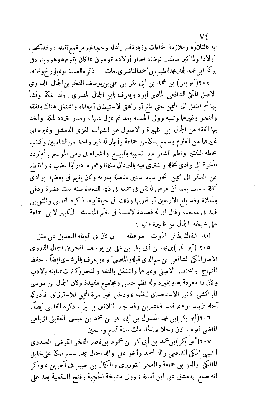 بِهِ كالتلاوة وملازمة الْجَمَاعَات وزيارة قُبُور أَهله وحجه غير مرّة مَعَ تقلله وَقد أَنْجَب أَوْلَادًا وَلما كبر ضعفت نهضته فَصَارَ أَوْلَاده يقومُونَ بِمَا كَانَ يقوم بِهِ وَهُوَ وَبَنوهُ فِي بركَة ابْن عَمه الْجمال مُحَمَّد الطّيب بن أَحْمد النَّاشِرِيّ مَاتَ ذكره الْعَفِيف وَلم يؤرخ وَفَاته 204 (أَبُو بكر) بن مُحَمَّد بن أبي بكر بن عَليّ بن يُوسُف الْفَخر بن الْجمال الذروي الأَصْل الْمَكِّيّ الشَّافِعِي الْمَاضِي أَبوهُ وَيعرف بِابْن الْجمال الْمصْرِيّ ولد بِمَكَّة وَنَشَأ بهَا ثمَّ انْتقل إِلَى الْيمن حَتَّى بلغ أَو راهق لاستيطان أَبِيه إِيَّاه واشتغل هُنَاكَ بالفقه والنحو وَغَيرهمَا وتنبه وَولي الْحِسْبَة بعد ثمَّ عزل عَنْهَا وَصَارَ يتَرَدَّد لمَكَّة وَأخذ بهَا الْفِقْه عَن الْجمال بن ظيهرة وَالْأُصُول عَن الشهَاب الْغَزِّي الدِّمَشْقِي وَغَيره إِلَى غَيرهمَا من الْعُلُوم وَسمع بِمَكَّة من جمَاعَة وَأَجَازَ لَهُ غير وَاحِد من الشاميين وَكتب بِخَطِّهِ الْكثير ونظم الشّعْر مَعَ تسببه بِالْبيعِ وَالشِّرَاء فِي زمن الْمَوْسِم ثمَّ تردد بِأخرَة إِلَى وَادي نَخْلَة وَاشْترى فِيهِ بالبردان مَكَانا وَعمر بِهِ دَارا بالتنضب وَانْقطع عَن السّفر إِلَى الْيمن نَحْو سبع سِنِين مُتَّصِلَة بِمَوْتِهِ وَكَانَ يُقيم فِي بَعْضهَا بوادي نَخْلَة مَاتَ بعد أَن عرض لَهُ ثقل فِي سَمعه فِي ذِي الْقعدَة سنة سِتّ عشرَة وَدفن بالمعلاة وَقد بلغ الْأَرْبَعين أَو قاربها وَذَلِكَ فِي حَيَاة أَبِيه ذكره الفاسي والتقي بن فَهد فِي مُعْجَمه قَالَ أَن لَهُ قصيدة لامية فِي ختم المنسك الْكَبِير لِابْنِ جمَاعَة على شَيْخه الْجمال بن ظهيرة مِنْهَا