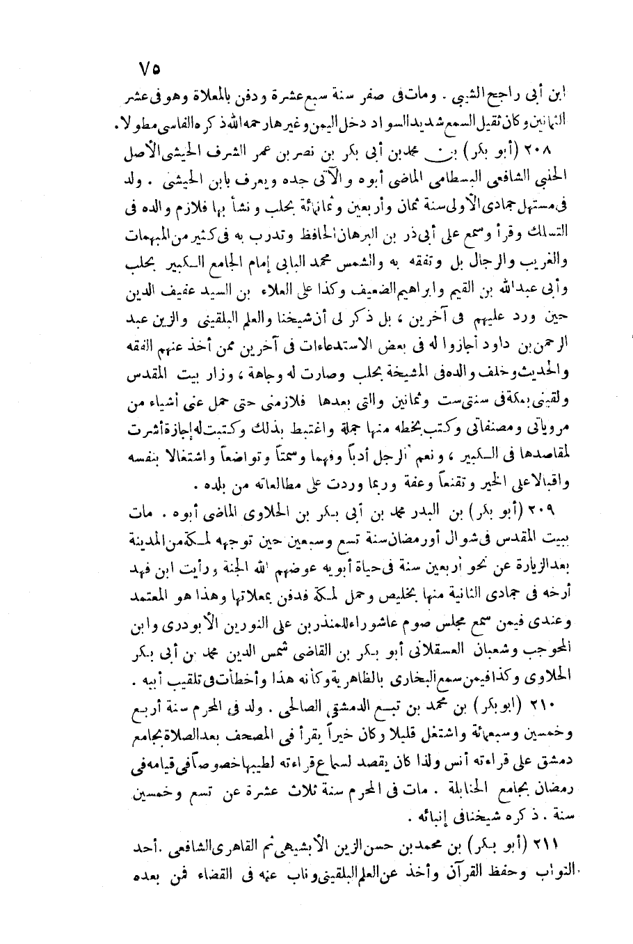 ابْن أبي رَاجِح الشيبي وَمَات فِي صفر سنة سبع عشرَة وَدفن بالمعلاة وَهُوَ فِي عشر الثَّمَانِينَ وَكَانَ ثقيل السّمع شَدِيد السوَاد دخل الْيمن وَغَيرهَا رَحمَه الله ذكره الفاسي مطولا 20 {أَبُو بكر) بن مُحَمَّد بن أبي بكر بن نصر بن عمر الشّرف الحيشي الأَصْل الْحلَبِي الشَّافِعِي البسطامي الْمَاضِي أَبوهُ والآتي جده وَيعرف بِابْن الحيشي ولد فِي مستهل جُمَادَى الأولى سنة ثَمَان وَأَرْبَعين وَثَمَانمِائَة بحلب وَنَشَأ بهَا فلازم وَالِده فِي التسلك وَقَرَأَ وَسمع على أبي ذَر بن الْبُرْهَان الْحَافِظ وتدرب بِهِ فِي كثير من المبهمات والغريب وَالرِّجَال بل وتفقه بِهِ وَالشَّمْس مُحَمَّد البابي إِمَام الْجَامِع الْكَبِير بحلب وَأبي عبد الله بن الْقيم وَإِبْرَاهِيم الضَّعِيف وَكَذَا على الْعَلَاء بن السَّيِّد عفيف الدّين حِين ورد عَلَيْهِم فِي آخَرين بل ذكر لي أَن شَيخنَا وَالْعلم البُلْقِينِيّ والزين عبد الرَّحْمَن بن دَاوُد أَجَازُوا لَهُ فِي بعض الاستدعاءات فِي آخَرين مِمَّن أَخذ عَنْهُم الْفِقْه والْحَدِيث وَخلف وَالِده فِي المشيخة بحلب وَصَارَت لَهُ وجاهة وزار بَيت الْمُقَدّس ولقيني بِمَكَّة فِي سنتي سِتّ وَثَمَانِينَ وَالَّتِي بعْدهَا فلازمني حَتَّى حمل عني أَشْيَاء من مروياتي ومصنفاتي وَكتب بِخَطِّهِ مِنْهَا جملَة واغتبط بذلك وكتبت لَهُ إجَازَة أَشرت لمقاصدها فِي الْكَبِير وَنعم الرجل أدبا وفهما وسمتا وتواضعا واشتغالا بِنَفسِهِ وإقبالا على الْخَيْر وتقنعا وعفة وَرُبمَا وَردت على مطالعاته من بَلَده 209 (أَبُو بكر) بن الْبَدْر مُحَمَّد بن أبي بكر بن الحلاوي الْمَاضِي أَبوهُ مَاتَ بِبَيْت الْمُقَدّس فِي شَوَّال أَو رَمَضَان سنة تسع وَسبعين حِين توجهه لمَكَّة من الْمَدِينَة بعد الزِّيَارَة عَن نَحْو أَرْبَعِينَ سنة فِي حَيَاة أَبَوَيْهِ عوضهم الله الْجنَّة وَرَأَيْت ابْن فَهد أرخه فِي جُمَادَى الثَّانِيَة مِنْهَا بخليص وَحمل لمَكَّة فَدفن بمعلاتها وَهَذَا هُوَ الْمُعْتَمد وَعِنْدِي فِيمَن سمع مجْلِس صَوْم عَاشُورَاء للمنذر بن عَليّ النورين الأبودري وَابْن المحوجب وَشَعْبَان الْعَسْقَلَانِي أَبُو بكر بن القَاضِي شمس الدّين مُحَمَّد بن أبي بكر الحلاوي وَكَذَا فِيمَن سمع البُخَارِيّ بالظاهرية وَكَأَنَّهُ هَذَا وأخطأت فِي تلقيب أَبِيه 210 (أَبُو بكر) بن مُحَمَّد بن تبع الدِّمَشْقِي الصَّالِحِي ولد فِي الْمحرم سنة أَربع وَخمسين وَسَبْعمائة واشتغل قَلِيلا وَكَانَ خيرا يقْرَأ فِي الْمُصحف بعد الصَّلَاة بِجَامِع دمشق على قِرَاءَته أنس وَلذَا كَانَ يقْصد لسَمَاع قِرَاءَته لطيبها خُصُوصا فِي قِيَامه فِي رَمَضَان بِجَامِع الْحَنَابِلَة مَاتَ فِي الْمحرم سنة ثَلَاث عشرَة عَن تسع وَخمسين سنة ذكره شَيخنَا فِي إنبائه 21 (أَبُو بكر) بن مُحَمَّد بن حسن الزين الأبشيهي ثمَّ القاهري الشَّافِعِي أحد النواب وَحفظ الْقُرْآن وَأخذ عَن الْعلم البُلْقِينِيّ وناب عَنهُ فِي الْقَضَاء فَمن بعده