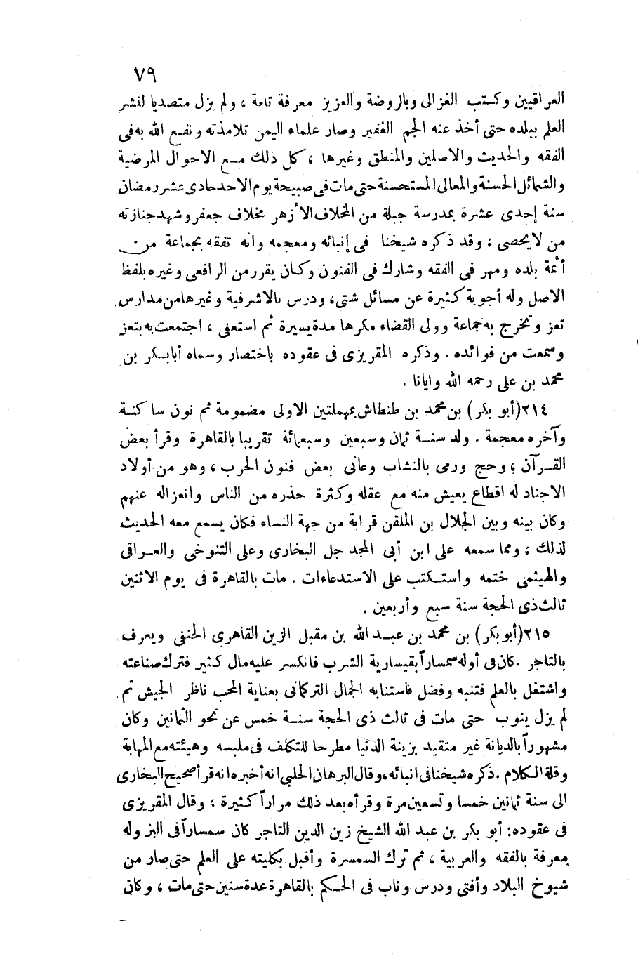 الْعِرَاقِيّين وَكتب الْغَزالِيّ وبالروضة والعزيز معرفَة تَامَّة وَلم يزل متصديا لنشر لعلم بِبَلَدِهِ حَتَّى أَخذ عَنهُ الجم الْغَفِير وَصَارَ عُلَمَاء الْيمن تلامذته ونفع الله بِهِ فِي الْفِقْه والْحَدِيث والأصلين والمنطق وَغَيرهَا كل ذَلِك مَعَ الْأَحْوَال المرضية وَالشَّمَائِل الْحَسَنَة والمعالي المستحسنة حَتَّى مَاتَ فِي صَبِيحَة يَوْم الْأَحَد حادي عشر رَمَضَان سنة إِحْدَى عشرَة بمدرسة جبلة من المخلاف الْأَزْهَر مخلاف جَعْفَر وَشهد جنَازَته من لَا يُحْصى وَقد ذكره شَيخنَا فِي إنبائه ومعجمه وَأَنه تفقه بِجَمَاعَة من أَئِمَّة بَلَده وَمهر فِي الْفِقْه وشارك فِي الْفُنُون وَكَانَ يُقرر من الرَّافِعِيّ وَغَيره بِلَفْظ الأَصْل وَله أجوبة كَثِيرَة عَن مسَائِل شَتَّى ودرس بالأشرفية وَغَيرهَا من مدارس تعز وَتخرج بِهِ جمَاعَة وَولي الْقَضَاء مكْرها مُدَّة يسيرَة ثمَّ استعفى اجْتمعت بِهِ بتعز وَسمعت من فَوَائده وَذكره المقريزي فِي عقوده بِاخْتِصَار وَسَماهُ أَبَا بكر بن مُحَمَّد بن عَليّ رَحمَه الله وإيانا 214 (أَبُو بكر) بن مُحَمَّد بن طنطاش بمهملتين الأولى مَضْمُومَة ثمَّ نون سَاكِنة وَآخره مُعْجمَة ولد سنة ثَمَان وَسبعين وَسَبْعمائة تَقْرِيبًا بِالْقَاهِرَةِ وَقَرَأَ بعض الْقُرْآن وَحج وَرمى بالنشاب وعانى بعض فنون الْحَرْب وَهُوَ من أَوْلَاد الأجناد لَهُ اقطاع يعِيش مِنْهُ مَعَ عقله وَكَثْرَة حذره من النَّاس وانعزاله عَنْهُم وَكَانَ بَينه وَبَين الْجلَال بن الملقن قرَابَة من جِهَة النِّسَاء فَكَانَ يسمع مَعَه الحَدِيث لذَلِك وَمِمَّا سَمعه على ابْن أبي الْمجد جلّ البُخَارِيّ وعَلى التنوخي والعراقي والهيثمي خَتمه واستكتب على الاستدعاءات مَاتَ بِالْقَاهِرَةِ فِي يَوْم الِاثْنَيْنِ ثَالِث ذِي الْحجَّة سنة سبع وَأَرْبَعين 215 (أَبُو بكر) بن مُحَمَّد بن عبد الله بن مقبل الزين القاهري الْحَنَفِيّ وَيعرف بالتاجر كَانَ فِي أَوله سمسارا بقيسارية الشّرْب فانكسر عَلَيْهِ مَال كثير فَترك صناعته واشتغل بِالْعلمِ فَتنبه وَفضل فاستنابه الْجمال التركماني بعناية الْمُحب نَاظر الْجَيْش ثمَّ لم يزل يَنُوب حَتَّى مَاتَ فِي ثَالِث ذِي الْحجَّة سنة خمس عَن نَحْو الثَّمَانِينَ وَكَانَ مَشْهُورا بالديانة غير متقيد بزينة الدُّنْيَا مطرحا للتكلف فِي ملبسه وهيئته مَعَ المهابة وَقلة الْكَلَام ذكره شَيخنَا فِي إنبائه وَقَالَ الْبُرْهَان الْحلَبِي أَنه أخبرهُ أَنه قَرَأَ صَحِيح البُخَارِيّ إِلَى سنة ثَمَانِينَ خمْسا وَتِسْعين مرّة وقرأه بعد ذَلِك مرَارًا كَثِيرَة وَقَالَ المقريزي فِي عقوده أَبُو بكر بن عبد الله الشَّيْخ زين الدّين التَّاجِر كَانَ سمسارا فِي الْبَز وَله معرفَة بالفقه والعربية ثمَّ ترك السمسرة وَأَقْبل بكليته على الْعلم حَتَّى صَار من شُيُوخ الْبِلَاد وَأفْتى ودرس وناب فِي الحكم بِالْقَاهِرَةِ عدَّة سِنِين حَتَّى مَاتَ وَكَانَ