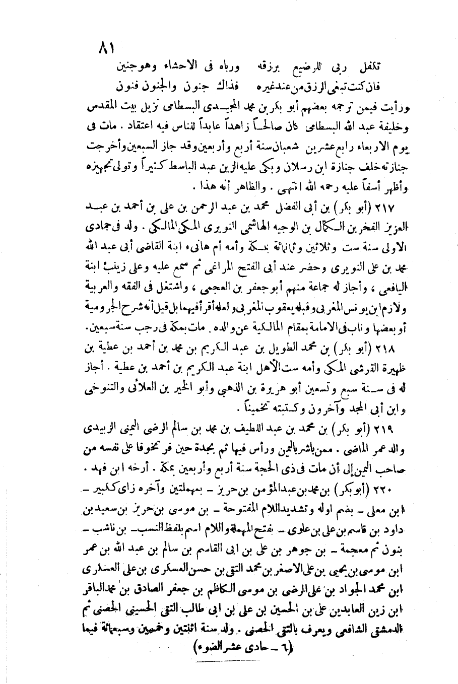 وَرَأَيْت فِيمَن تَرْجمهُ بَعضهم أَبُو بكر بن مُحَمَّد المجيدي البسطامي نزيل بَيت الْمُقَدّس وَخَلِيفَة عبد الله البسطامي كَانَ صَالحا زاهدا عابدا للنَّاس فِيهِ اعْتِقَاد مَاتَ فِي يَوْم الْأَرْبَعَاء رَابِع عشْرين شعْبَان سنة أَربع وَأَرْبَعين وَقد جَازَ السّبْعين وأخرجت جنَازَته خلق جَنَازَة ابْن رسْلَان وَبكى عَلَيْهِ الزين عبد الباسط كثيرا وَتَوَلَّى تَجْهِيزه وَأظْهر أسفا عَلَيْهِ رَحمَه الله انْتهى وَالظَّاهِر أَنه هَذَا 217 (أَبُو بكر) بن أبي الْفضل مُحَمَّد بن عبد الرَّحْمَن بن عَليّ بن أَحْمد بن عبد الْعَزِيز الْفَخر بن الْكَمَال بن الْوَجِيه الْهَاشِمِي النويري الْمَكِّيّ الْمَالِكِي ولد فِي جُمَادَى الأولى سنة سِتّ وَثَلَاثِينَ وَثَمَانمِائَة بِمَكَّة وَأمه أم هَانِئ ابْنة القَاضِي أبي عبد الله مُحَمَّد بن عَليّ النويري وَحضر عِنْد أبي الْفَتْح المراغي ثمَّ سمع عَلَيْهِ وعَلى زَيْنَب ابْنة اليافعي وَأَجَازَ لَهُ جمَاعَة مِنْهُم أَبُو جَعْفَر بن العجمي واشتغل فِي الْفِقْه والعربية ولازم بن يُونُس المغربي وَقَبله يَعْقُوب المغربي وَلَعَلَّه أَقرَأ فيهمَا بل قيل أَنه شرح الجرومية أَو بَعْضهَا وناب فِي الإِمَام بمقام الْمَالِكِيَّة عَن وَالِده مَاتَ بِمَكَّة فِي رَجَب سنة سبعين 21 {أَبُو بكر) بن مُحَمَّد الطَّوِيل بن عبد الْكَرِيم بن مُحَمَّد بن أَحْمد بن عَطِيَّة بن ظهيرة الْقرشِي الْمَكِّيّ وَأمه سِتّ الْأَهْل ابْنة عبد الْكَرِيم بن أَحْمد بن عَطِيَّة أجَاز لَهُ فِي سنة سبع وَتِسْعين أَبُو هُرَيْرَة بن الذَّهَبِيّ وَأَبُو الْخَيْر بن العلائي والتنوخي وَابْن أبي الْمجد وَآخَرُونَ وكتبته تخمينا 219 (أَبُو بكر) بن مُحَمَّد بن عبد اللَّطِيف بن مُحَمَّد بن سَالم الرضي اليمني الزبيدِيّ وَالِد عمر الْمَاضِي مِمَّن بَاشر بِالْيمن وَرَأس فِيهَا ثمَّ بجدة حِين فَرد تخوفا على نَفسه من صَاحب الْيمن إِلَى أَن مَاتَ فِي ذِي الْحجَّة سنة أَربع وَأَرْبَعين بِمَكَّة أرخه ابْن فَهد 220 (أَبُو بكر) بن مُحَمَّد بن عبد الْمُؤمن بن حريز بمهملتين وَآخره زَاي ككبير ابْن مُعلى بِضَم أَوله وَتَشْديد اللَّام الْمَفْتُوحَة بن مُوسَى بن حريز بن سعيد بن دَاوُد بن قَاسم بن عَليّ بن علوي بِفَتْح الْمُهْملَة وَاللَّام اسْم بِلَفْظ النّسَب بن ناشب بنُون ثمَّ مُعْجمَة بن جَوْهَر بن عَليّ بن أبي الْقَاسِم بن سَالم بن عبد الله بن عمر بن مُوسَى بن يحيى بن عَليّ الْأَصْغَر بن مُحَمَّد التقي بن حسن العسكري بن عَليّ العسكري بن مُحَمَّد الْجواد بن عَليّ الرضى بن مُوسَى الكاظم بن جَعْفَر الصَّادِق بن مُحَمَّد الباقر بن زين العابدين عَليّ بن الْحُسَيْن بن عَليّ بن أبي طَالب التقى الْحُسَيْنِي الحصني ثمَّ الدِّمَشْقِي الشَّافِعِي وَيعرف بالتقي الحصني ولد سنة اثْنَتَيْنِ وَخمسين وَسَبْعمائة فِيمَا