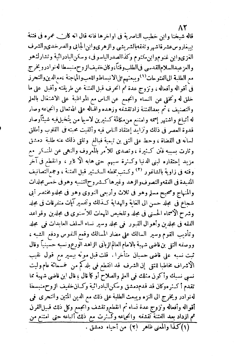 قَالَه شَيخنَا وَابْن خطيب الناصرية فِي أواخرها فَإِنَّهُ قَالَ إِنَّه كَانَ عمره فِي فتْنَة بييغاروس عشرَة أشهر وتفقه بالشريشي وَالزهْرِيّ وَابْن الجابي والصرخدي والشرف الْغَزِّي وَابْن غنوم وَابْن مَكْتُوم وَكَذَا الصَّدْر الياسوفي وَسكن البادرائية وتشارك هُوَ والعز عبد السَّلَام الْقُدسِي فِي الطّلب وقتا وَكَانَ خَفِيف الرّوح منبسطا لَهُ نَوَادِر وَيخرج مَعَ الطّلبَة إِلَى الفتوحات ويبعثهم على الإنبساط واللعب والمماجنة مَعَ الدّين والتحرز فِي أَقْوَاله وأفعاله وَتزَوج عدَّة ثمَّ انحرف قبل الْفِتْنَة عَن طَرِيقَته وَأَقْبل على مَا خلق لَهُ وتخلى عَن النِّسَاء وانجمع عَن النَّاس مَعَ الْمُوَاظبَة على الِاشْتِغَال بِالْعلمِ والتصنيف ثمَّ بعد الْفِتْنَة زَاد تقشفه وزهده وإقباله على الله تَعَالَى وانجماعه وَصَارَ لَهُ أَتبَاع واشتهر اسْمه وَامْتنع من مكالمة كثيرين لَا سِيمَا من يتخيل فِيهِ شَيْئا وَصَارَ قدوة الْعَصْر فِي ذَلِك وتزايد اعْتِقَاد النَّاس فِيهِ وألقيت محبته فِي الْقُلُوب وَأطلق لِسَانه فِي الْقُضَاة وَحط على التقي بن تَيْمِية فَبَالغ وتلقى ذَلِك عَنهُ طلبة دمشق وثارت بِسَبَبِهِ فتن كَثِيرَة وتصدى لِلْأَمْرِ بِالْمَعْرُوفِ وَالنَّهْي عَن الْمُنكر مَعَ مزِيد احتقاره لبني الدُّنْيَا وَكَثْرَة سبهم حَتَّى هابه الأكابر وَانْقطع فِي آخر وقته فِي زَاوِيَة بالشاغور وَكتب بِخَطِّهِ الْكثير قبل الْفِتْنَة وَجمع التصانيف المفيدة فِي الْفِقْه والتصوف والزهد وَغَيرهَا كشروح التَّنْبِيه وَهُوَ فِي خمس مجلدات والمنهاج وصحيح مُسلم وَهُوَ فِي ثَلَاث وأربعي النَّوَوِيّ وَهُوَ فِي مُجَلد ومختصر أبي شُجَاع فِي مُجَلد حسن إِلَى الْغَايَة وَالْهِدَايَة كَذَلِك وَتَفْسِير آيَات متفرقات فِي مُجَلد وَشرح الْأَسْمَاء الْحسنى فِي مُجَلد وتلخيص الْمُهِمَّات للأسنوي فِي مجلدين وقواعد الْفِقْه فِي مجلدين وأهوال الْقُبُور فِي مُجَلد وسير نسَاء السّلف العابدات فِي مُجَلد وتأديب الْقَوْم وسير السالك على مضار المسالك وقمع النُّفُوس وَدفع الشّبَه وَوَصفه التقي بن قَاضِي شُهْبَة بِالْإِمَامِ الْعَالم الرباني الزَّاهِد الْوَرع وَنسبه حسينيا وَقَالَ ثَبت نسبه على قَاضِي حسبان مُتَأَخِّرًا قلت قبل مَوته بِيَسِير مَعَ قَول نقيب الْأَشْرَاف مُخَاطبا للتقي إِن الشّرف قد انْقَطع فِي بلدكم من خَمْسمِائَة عَام وليت نسبي نسبك وأكون مثلك فِي الْعلم وَالصَّلَاح أَو كَمَا قَالَ قَالَ ابْن قَاضِي شُهْبَة مِمَّا تقدم أَكْثَره وَكَانَ قد قدم دمشق وَسكن البادرائية وَكَانَ خَفِيف الرّوح منبسطا لَهُ نَوَادِر وَيخرج إِلَى النزه وَيبْعَث الطّلبَة على ذَلِك مَعَ الدّين المتين والتحري فِي أَقْوَاله وأفعاله وَتزَوج عدَّة نسَاء ثمَّ انْقَطع وتقشف وانجمع وكل ذَلِك قبيل الْقرن ثمَّ ازْدَادَ بعد الْفِتْنَة تقشفه وانجماعه وَكَثُرت مَعَ ذَلِك أَتْبَاعه حَتَّى امْتنع من