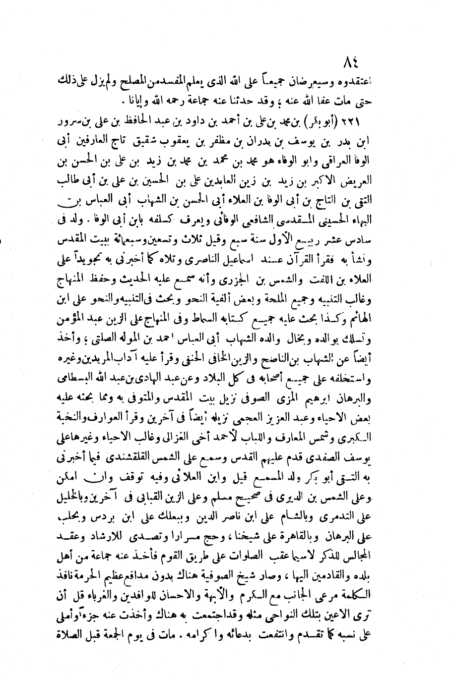 اعتقدوه وسيعرضان جَمِيعًا على الله الَّذِي يعلم الْمُفْسد من المصلح وَلم يزل على ذَلِك حَتَّى مَاتَ عَفا الله عَنهُ وَقد حَدثنَا عَنهُ جمَاعَة رَحمَه الله وإيانا 22 (أَبُو بكر) بن مُحَمَّد بن عَليّ بن أَحْمد بن دَاوُد بن عبد الْحَافِظ بن عَليّ بن سرُور بن بدر بن يُوسُف بن بدران بن مظفر بن يَعْقُوب شَقِيق تَاج العارفين أبي الوفا الْعِرَاقِيّ وَأَبُو الْوَفَاء هُوَ مُحَمَّد بن مُحَمَّد بن مُحَمَّد بن زيد بن عَليّ بن الْحسن بن العريض الْأَكْبَر بن زيد بن زين العابدين عَليّ بن الْحُسَيْن بن عَليّ بن أبي طَالب التقي بن التَّاج بن أبي الوفا بن الْعَلَاء أبي الْحسن بن الشهَاب أبي الْعَبَّاس بن الْبَهَاء الْحُسَيْنِي الْمَقْدِسِي الشَّافِعِي الوفائي وَيعرف كسلفه بِابْن أبي الوفا ولد فِي سادس عشر ربيع الأول سنة سبع وَقيل ثَلَاث وَتِسْعين وَسَبْعمائة بِبَيْت الْمُقَدّس وَنَشَأ بِهِ فَقَرَأَ الْقُرْآن عِنْد اسماعيل الناصري وتلاه كَمَا أَخْبرنِي بِهِ تجويدا على الْعَلَاء بن اللفت وَالشَّمْس بن الْجَزرِي وَأَنه سمع عَلَيْهِ الحَدِيث وَحفظ الْمِنْهَاج وغالب التَّنْبِيه وَجَمِيع الملحة وَبَعض ألفية النَّحْو وَبحث فِي التَّنْبِيه والنحو على ابْن الهائم وَكَذَا بحث عَلَيْهِ جَمِيع كِتَابه السماد وَفِي الْمِنْهَاج على الزين عبد الْمُؤمن وتسلك بوالده وبخال وَالِده الشهَاب أبي الْعَبَّاس أَحْمد بن الموله الصلتي وَأخذ أَيْضا عَن الشهَاب بن الناصح والزين الخافي الْحَنَفِيّ وَقَرَأَ عَلَيْهِ آدَاب المريدين وَغَيره واستخلفه على جَمِيع أَصْحَابه فِي كل الْبِلَاد وَعَن عبد الْهَادِي بن عبد الله البسطامي والبرهان إِبْرَاهِيم الْمزي الصُّوفِي نزيل بَيت الْمُقَدّس والمتوفي بِهِ وَمِمَّا بَحثه عَلَيْهِ بعض الْأَحْيَاء وَعبد الْعَزِيز العجمي نزيله أَيْضا فِي آخَرين وَقَرَأَ العوارف والنخبة الْكُبْرَى وشمس المعارف واللباب لِأَحْمَد أخي الْغَزالِيّ وغالب الْأَحْيَاء وَغَيرهَا على يُوسُف الصَّفَدِي قدم عَلَيْهِم الْقُدس وَسمع على الشَّمْس القلقشندي فِيمَا أَخْبرنِي بِهِ التقي أَبُو بكر ولد المسمع قيل وَابْن العلائي وَفِيه توقف وَإِن أمكن وعَلى الشَّمْس بن الديري فِي صَحِيح مُسلم وعَلى الزين القبابي فِي آخَرين وبالخليل على التدمري وبالشام على ابْن نَاصِر الدّين وببعلك على ابْن بردس وبحلب على الْبُرْهَان وبالقاهرة على شَيخنَا وَحج مرَارًا وتصدى للإرشاد وَعقد الْمجَالِس للذّكر لاسيما عقب الصَّلَوَات على طَرِيق الْقَوْم فَأخذ عَنهُ جمَاعَة من أهل بَلَده والقادمين إِلَيْهَا وَصَارَ شيخ الصُّوفِيَّة هُنَاكَ بِدُونِ مدافع عَظِيم الْحُرْمَة نَافِذ الْكَلِمَة مرعي الْجَانِب مَعَ الْكَرم والأبهة وَالْإِحْسَان للوافدين والغرباء قل أَن ترى الْأَعْين بِتِلْكَ النواحي مثله وَقد اجْتمعت بِهِ هُنَاكَ وَأخذت عَنهُ جُزْءا وأملى على نسبه كَمَا تقدم وانتفعت بدعائ وإكرامه مَاتَ فِي يَوْم الْجُمُعَة قبل الصَّلَاة