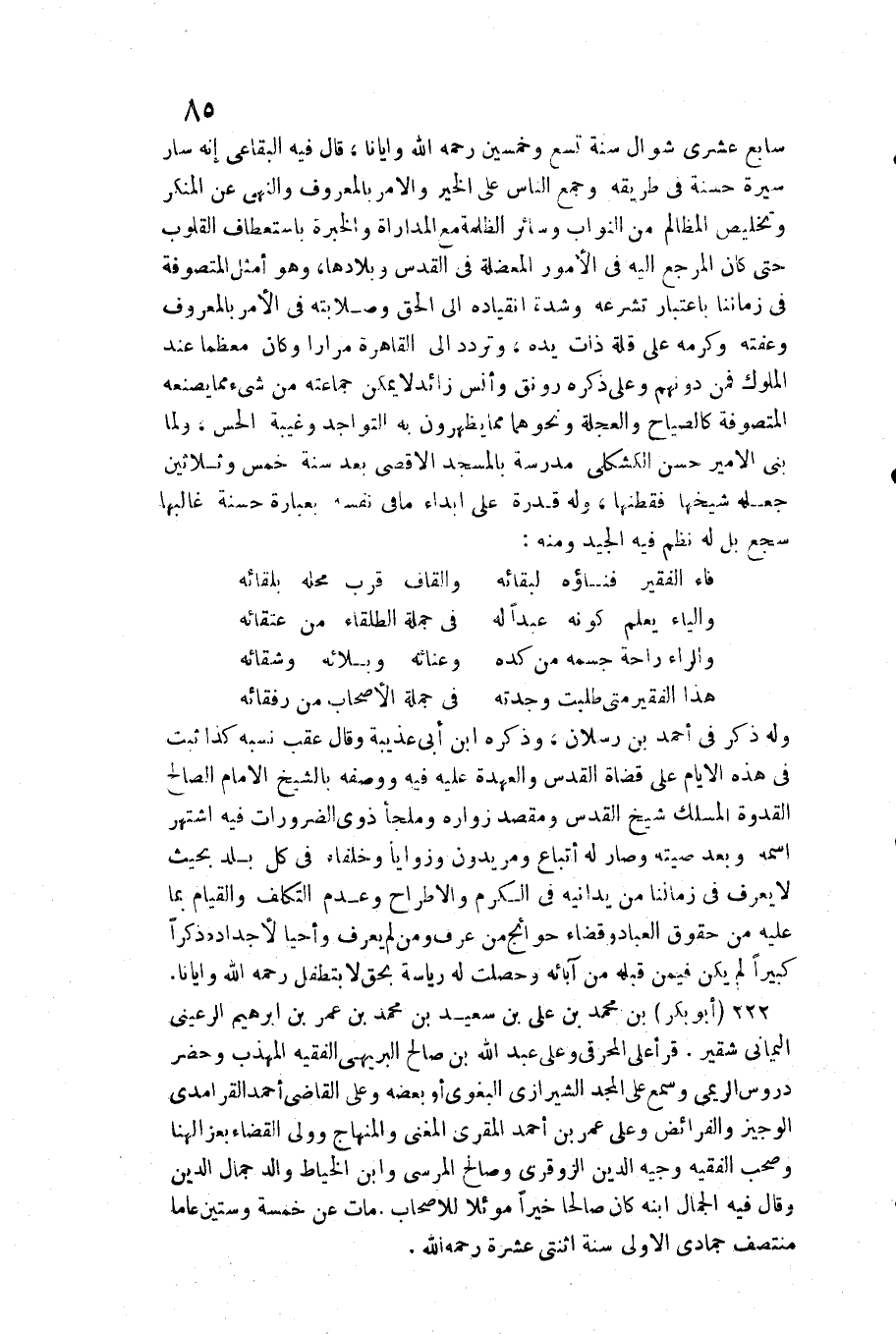 وَله ذكر فِي أَحْمد بن رسْلَان وَذكره ابْن أبي عذيبة وَقَالَ عقب نسبه كَذَا ثَبت فِي هَذِه الْأَيَّام على قُضَاة الْقُدس والعهدة عَلَيْهِ فِيهِ وَوَصفه بالشيخ الإِمَام الصَّالح الْقدْوَة المسلك شيخ الْقُدس ومقصد زواره وملجأ ذَوي الضرورات فِيهِ اشْتهر اسْمه وَبعد صيته وَصَارَ لَهُ أَتبَاع ومريدون وزوايا وخلفاء فِي كل بلد بِحَيْثُ لَا يعرف فِي زَمَاننَا من يدانيه فِي الْكَرم والاطراح وَعدم التَّكَلُّف وَالْقِيَام بِمَا عَلَيْهِ من حُقُوق الْعباد وَقَضَاء حوائج من عرف وَمن لم يعرف وَأَحْيَا لأجداده ذكرا كَبِير لم يكن فِيمَن قبله من آبَائِهِ وحصلت لَهُ رياسة بِحَق لَا بتطفل رَحمَه الله وإيانا 22 (أَبُو بكر) بن مُحَمَّد بن عَليّ بن سعيد بن مُحَمَّد بن عمر بن إِبْرَاهِيم الرعيني الْيَمَانِيّ شقير قَرَأَ على المحرق وعَلى عبد الله بن صَالح البريهي الْفَقِيه الْمُهَذّب وَحضر دروس الريمي وَسمع على الْمجد الشِّيرَازِيّ الْبَغَوِيّ أَو بعضه وعَلى القَاضِي أَحْمد القرامدي الْوَجِيز والفرائض وعَلى عمر بن أَحْمد الْمقري الْمُغنِي والمنهاج وَولي الْقَضَاء بعز الهنا وَصَحب الْفَقِيه وجيه الدّين الزوقري وَصَالح المرسي وَابْن الْخياط وَالِد جمال الدّين وَقَالَ فِيهِ الْجمال ابْنه كَانَ صَالحا خيرا موئلا للأصحاب مَاتَ عَن خَمْسَة وَسِتِّينَ عَاما منتصف جُمَادَى الأولى سنة اثنتى عشرَة رَحمَه الله