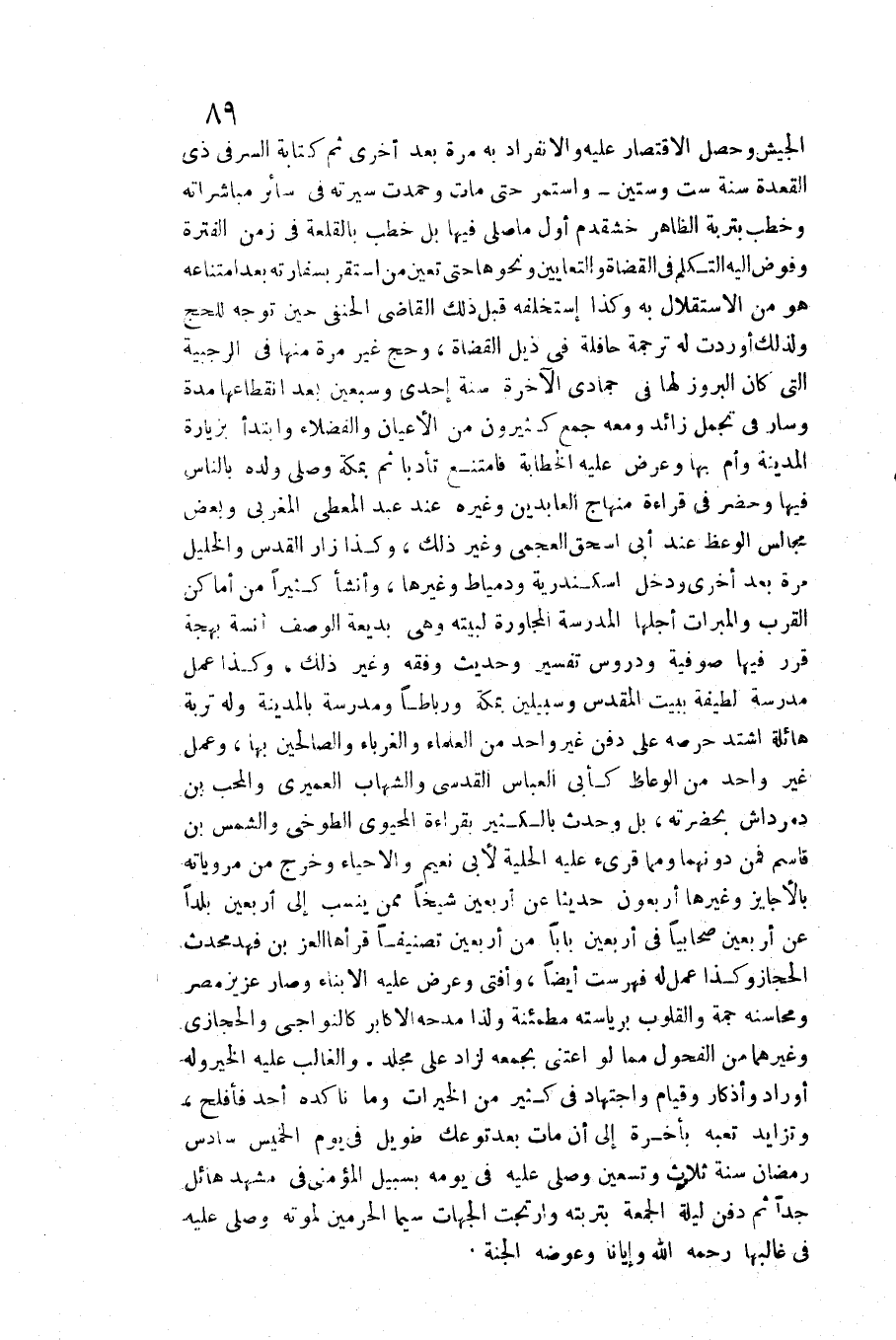 الْجَيْش وَحصل الِاقْتِصَار عَلَيْهِ والانفراد بِهِ مرّة بعد أُخْرَى ثمَّ كِتَابَة السِّرّ فِي ذِي الْقعدَة سنة سِتّ وَسِتِّينَ وَاسْتمرّ حَتَّى مَاتَ وحمدت سيرته فِي سَائِر مباشراته وخطب بتربة الظَّاهِر خشقدم أول مَا صلى فِيهَا بل خطب بالقلعة فِي زمن الفترة وفوض إِلَيْهِ التَّكَلُّم فِي الْقَضَاء والتعايين وَنَحْوهَا حَتَّى تعين من اسْتَقر بسفارته بعد امْتِنَاعه هُوَ من الِاسْتِقْلَال بِهِ وَكَذَا اسْتَخْلَفَهُ قبل ذَلِك القَاضِي الْحَنَفِيّ حِين توجه لِلْحَجِّ وَلذَلِك أوردت لَهُ تَرْجَمَة حافلة فِي ذيل الْقُضَاة وَحج غير مرّة مِنْهَا فِي الرجبية الَّتِي كَانَ البروز لَهَا فِي جُمَادَى الْآخِرَة سنة إِحْدَى وَسبعين بعد انقطاعها مُدَّة وَسَار فِي تجمع زَائِد وَمَعَهُ جمع كَثِيرُونَ من الْأَعْيَان والفضلاء وابتدأ بزيارة الْمَدِينَة وَأم بهَا وَعرض عَلَيْهِ الخطابة فَامْتنعَ تأدبا ثمَّ بِمَكَّة وَصلى وَلَده بِالنَّاسِ فِيهَا وَحضر فِي قِرَاءَة منهاج العابدين وَغَيره عِنْد عبد الْمُعْطِي المغربي وَبَعض مجَالِس الْوَعْظ عِنْد أبي اسحق العجمي وَغير ذَلِك وَكَذَا زار الْقُدس والخليل مرّة بعد أُخْرَى وَدخل اسكندرية ودمياط وَغَيرهَا وَأَنْشَأَ كثيرا من أَمَاكِن الْقرب والمبرات أجلهَا الْمدرسَة الْمُجَاورَة لبيته وَهِي بديعة الْوَصْف أنسة بهجة قرر فِيهَا صوفية ودروس تَفْسِير وَحَدِيث وَفقه وَغير ذَلِك وَكَذَا عمل مدرسة لَطِيفَة بِبَيْت الْمُقَدّس وسبيلين بِمَكَّة ورباطا ومدرسة بِالْمَدِينَةِ وَله تربة هائلة اشْتَدَّ حرصه على دفن غير وَاحِد من الْعلمَاء والغرباء وَالصَّالِحِينَ بهَا وَعمل غير وَاحِد من الوعاظ كَأبي الْعَبَّاس الْقُدسِي والشهاب العميري والمحب بن دمرداش بِحَضْرَتِهِ بل وَحدث بالكثير بِقِرَاءَة المحيوي الطوخي وَالشَّمْس بن قَاسم فَمن دونهمَا وَمِمَّا قرئَ عَلَيْهِ الْحِلْية لأبي نعيم والاحياء وَخرج من مروياته بالأجايز وَغَيرهَا أَرْبَعُونَ حَدِيثا عَن أَرْبَعِينَ شَيخا مِمَّن ينْسب إِلَى أَرْبَعِينَ بَلَدا عَن أَرْبَعِينَ صحابيا فِي أَرْبَعِينَ بَابا من أَرْبَعِينَ تصنيفا قَرَأَهَا الْعِزّ بن فَهد مُحدث الْحجاز وَكَذَا عمل لَهُ فهرست أَيْضا وَأفْتى وَعرض عَلَيْهِ الْأَبْنَاء وَصَارَ عَزِيز مصر ومحاسنه جمة والقلوب برياسته مطمئنة وَلذَا مدحه الأكابر كالنواجي والحجازي وَغَيرهمَا من الفحول مِمَّا لَو اعتنى بجمعه لزاد على مُجَلد وَالْغَالِب عَلَيْهِ الْخَيْر وَله أوراد وأذكار وَقيام واجتهاد فِي كثير من الْخيرَات وَمَا ناكده أحد فأفلح وتزايد تَعبه بِأخرَة إِلَى أَن مَاتَ بعد توعك طَوِيل فِي يَوْم الْخَمِيس سادس رَمَضَان سنة ثَلَاث وَتِسْعين وَصلى عَلَيْهِ فِي يَوْمه بسبيل الْمُؤمن فِي مشْهد هائل جدا ثمَّ دفن لَيْلَة الْجُمُعَة بتربته وارتجت الْجِهَات سِيمَا الْحَرَمَيْنِ لمَوْته وَصلى عَلَيْهِ فِي غالبها رَحمَه الله وإيانا وعوضه الْجنَّة