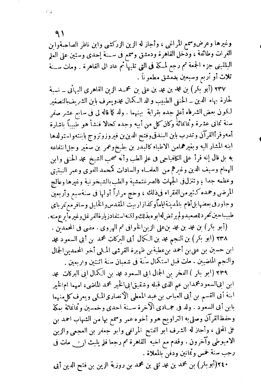 وَغَيرهَا وَعرض وَسمع المراغي وَأَجَازَ لَهُ الزين الزَّرْكَشِيّ وَابْن نَاظر الصاحبة وَابْن الْفُرَات وَطَائِفَة وَدخل الْقَاهِرَة ودمشق وَسمع فِي سنة إِحْدَى وَسِتِّينَ على الْعلم البُلْقِينِيّ جُزْء الْجُمُعَة ثمَّ رَجَعَ لمَكَّة فِي الَّتِي تَلِيهَا ثمَّ عَاد إِلَى الْقَاهِرَة وَمَات سنة ثَلَاث أَو أَربع وَسبعين بِدِمَشْق مطعونا 237 (أَبُو بكر) بن مُحَمَّد بن مُحَمَّد بن عَليّ بن مُحَمَّد الزين القاهري البهائي نِسْبَة لحارة بهاء الدّين الْحَنَفِيّ الطَّبِيب وَالِد الْكَمَال مُحَمَّد وَيعرف بِابْن الشريف بِالتَّصْغِيرِ لكَون بعض الشرفاء أعلم جده بِقرَابَة بَينهمَا ولد كَمَا قَالَه لي فِي سَابِع عشر صفر سنة ثَمَانِي عشرَة وَثَمَانمِائَة وَكَانَ كل من أَبِيه وجده كحالا فَنَشَأَ هُوَ طَبِيبا بِإِشَارَة أمه وَقَرَأَ الْقُرْآن وتدرب بِابْن البندقي وَفتح الدّين بن فَيْرُوز وَتزَوج بابنته واستولدها ابْنه الْمشَار إِلَيْهِ وبغيرهما من الْأَطِبَّاء كالبدر بن بطيخ وَعمر بن صَغِير وَجل انتفاعه بِهِ بل قَالَ إِنَّه قَرَأَ على الكافياجي فِي علم الطِّبّ وَأَنه صحب الشَّيْخ مُحَمَّد الْحَنَفِيّ وَابْن الْهمام وَسيف الدّين وَغَيرهم من الْعلمَاء والسادات كمحمد الفوى وَعمر النبتيتي وعظمه جدا وتنزل فِي الْجِهَات كالصرغتمشية والطب بالشيخونية وَغَيرهَا وعالج المرضى وحمده كثير من الْفُقَرَاء فِي ذَلِك وَحج مرَارًا أَولهَا فِي سنة سبع وَأَرْبَعين وجاور فِي بَعْضهَا بل أَقَامَ بِالْمَدِينَةِ أَيَّامًا وَكَذَا زار بَيت الْمُقَدّس والخليل وسافر مَعَ تمر باي طَبِيبا حِين تجرد للصعيد وَلم يرتض لَهُ أَبوهُ بذلك وَلكنه اسْتَفَادَ زِيَارَة الفرغل وَغَيره أبرع مِنْهُ (أَبُو بكر) بن مُحَمَّد بن مُحَمَّد بن عَليّ الزين الخوافي ثمَّ الْهَرَوِيّ مضى فِي المحمدين 23 {أَبُو بكر) بن النَّجْم مُحَمَّد بن الْكَمَال أبي البركات مُحَمَّد بن أبي السُّعُود مُحَمَّد بن حُسَيْن بن عَليّ بن أَحْمد بن عَطِيَّة بن ظهيرة الْقرشِي الْمَكِّيّ أَخُو المحمدين الْجمال والنجم الماضيين مَاتَ قبل استكمال سنة فِي شعْبَان سنة اثْنَتَيْنِ واربعين 239 (ابو بكر) الْفَخر بن الْجمال أبي السُّعُود مُحَمَّد بن الْكَمَال أبي البركات مُحَمَّد بن أبي السُّعُود مُحَمَّد ابْن عَم الَّذِي قبله وشقيق أبي الْخَيْر مُحَمَّد الْمَاضِي أمهما أم الْخَيْر ابْنة أبي الْقسم بن أبي الْعَبَّاس بن عبد الْمُعْطِي الْأنْصَارِيّ الْمَكِّيّ وَيعرف كل مِنْهُمَا بِابْن أبي السُّعُود ولد فِي جُمَادَى الْآخِرَة سنة إِحْدَى وَخمسين وَثَمَانمِائَة بِمَكَّة وَحفظ الْقُرْآن وَصلى بِهِ التَّرَاوِيح هُوَ وَأَخُوهُ عمر وَسمع بهَا من الشهَاب أَحْمد بن عَليّ الْمحلي وَأَجَازَ لَهُ الشّرف أَبُو الْفَتْح المراغي وَأَبُو جَعْفَر بن العجمي والزين الأميوطي وَآخَرُونَ وَقدم مَعَ أَخِيه الْقَاهِرَة ثمَّ رجعا فَلم يلبث أَن مَاتَ فِي رَجَب سنة خمس وَثَمَانِينَ وَدفن بالمعلاة 240 (أَبُو بكر) بن مُحَمَّد بن مُحَمَّد تَقِيّ بن مُحَمَّد بن روزبة الزين بن فتح الدّين أبي