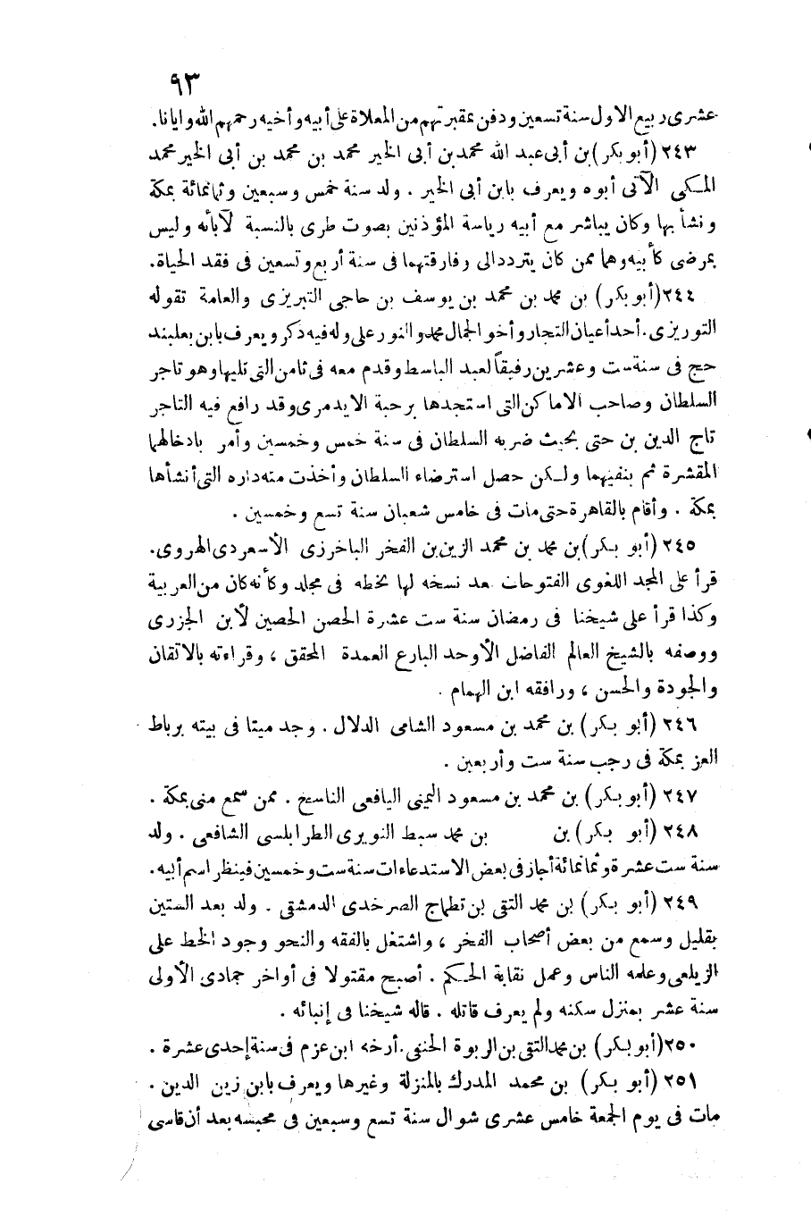 عشري ربيع الأول سنة تسعين وَدفن بمقبرتهم من المعلاة على أَبِيه وأخيه رَحِمهم الله وإيانا 243 (أَبُو بكر) بن أبي عبد الله مُحَمَّد بن أبي الْخَيْر مُحَمَّد بن مُحَمَّد بن أبي الْخَيْر مُحَمَّد الْمَكِّيّ الْآتِي أَبوهُ وَيعرف بِابْن أبي الْخَيْر ولد سنة خمس وَسبعين وَثَمَانمِائَة بِمَكَّة وَنَشَأ بهَا وَكَانَ يُبَاشر مَعَ أَبِيه رياسة المؤذنين بِصَوْت طري بِالنِّسْبَةِ لِآبَائِهِ وَلَيْسَ بمرضى كأبيه وهما مِمَّن كَانَ يتَرَدَّد إِلَيّ وفارقتهما فِي سنة أَربع وَتِسْعين فِي فقد الْحَيَاة 244 (أَبُو بكر) بن مُحَمَّد بن مُحَمَّد بن يُوسُف بن حاجي التبريزي والعامة تَقوله التوريزي أحد أَعْيَان التُّجَّار وأخو الْجمال مُحَمَّد والنور على وَله فِيهِ ذكر وَيعرف بِابْن بعلبند حج فِي سنة سِتّ وَعشْرين رَفِيقًا لعبد الباسط وَقدم مَعَه فِي ثامن الَّتِي تَلِيهَا وَهُوَ تَاجر السُّلْطَان وَصَاحب الْأَمَاكِن الَّتِي استجدها برحبة الأيدمري وَقد رَافع فِيهِ التَّاجِر تَاج الدّين بن حَتَّى بِحَيْثُ ضربه السُّلْطَان فِي سنة خمس وَخمسين وَأمر بإدخالهما المقشرة ثمَّ بنفيهما وَلَكِن حصل استرضاء السُّلْطَان وَأخذت مِنْهُ دَاره الَّتِي أَنْشَأَهَا بِمَكَّة وَأقَام بِالْقَاهِرَةِ حَتَّى مَاتَ فِي خَامِس شعْبَان سنة تسع وَخمسين 245 (أَبُو بكر) بن مُحَمَّد بن مُحَمَّد الزين بن الْفَخر الباخرزي الأسعردي الْهَرَوِيّ قَرَأَ على الْمجد اللّغَوِيّ الفتوحات بعد نسخه لَهَا بِخَطِّهِ فِي مُجَلد وَكَأَنَّهُ كَانَ من الْعَرَبيَّة وَكَذَا قَرَأَ على شَيخنَا فِي رَمَضَان سنة سِتّ عشرَة الْحصن الْحصين لِابْنِ الْجَزرِي وَوَصفه بالشيخ الْعَالم الْفَاضِل الأوحد البارع الْعُمْدَة الْمُحَقق وقراءته بالاتقان والجودة وَالْحسن ورافقه ابْن الْهمام 246 (أَبُو بكر) بن مُحَمَّد بن مَسْعُود الشَّامي الدَّلال وجد مَيتا فِي بَيته برباط الْعِزّ بِمَكَّة فِي رَجَب سنة سِتّ وَأَرْبَعين 247 (أَبُو بكر) بن مُحَمَّد بن مَسْعُود اليمني اليافعي النَّاسِخ مِمَّن سمع مني بِمَكَّة 24 {أَبُو بكر) بن مُحَمَّد بن مُحَمَّد سبط النويري الطرابلسي الشَّافِعِي ولد سنة سِتّ عشرَة وَثَمَانمِائَة أجَاز فِي بعض الاستدعاءات سنة سِتّ وَخمسين فَينْظر اسْم أَبِيه 249 (أَبُو بكر) بن مُحَمَّد التقي بن تطماج الصرخدي الدِّمَشْقِي ولد بعد السِّتين بِقَلِيل وَسمع من بعض أَصْحَاب الْفَخر واشتغل بالفقه والنحو وجود الْخط على الزَّيْلَعِيّ وَعلمه النَّاس وَعمل نقابة الحكم أصبح مقتولا فِي أَوَاخِر جُمَادَى الأولى سنة عشر بمنزل سكنه وَلم يعرف قَاتله قَالَه شَيخنَا فِي إنبائه 250 (أَبُو بكر) بن مُحَمَّد التقي بن الربوة الْحَنَفِيّ أرخه ابْن عزم فِي سنة إِحْدَى عشرَة 25 (أَبُو بكر) بن مُحَمَّد الْمدْرك بالمنزلة وَغَيرهَا وَيعرف بِابْن زين الدّين مَاتَ فِي يَوْم الْجُمُعَة خَامِس عشرى شَوَّال سنة تسع وَسبعين فِي محبسه بعد أَن قاسى