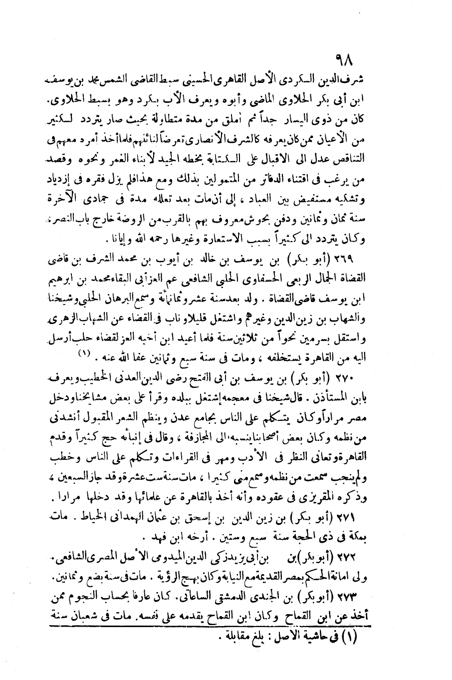 شرف الدّين الْكرْدِي الأَصْل القاهري الْحُسَيْنِي سبط القَاضِي الشَّمْس مُحَمَّد بن يُوسُف بن أبي بكر الحلاوي الْمَاضِي وَأَبوهُ وَيعرف الْأَب بكرد وَهُوَ بسبط الحلاوي كَانَ من ذَوي الْيَسَار جدا ثمَّ أملق من مُدَّة متطاولة بِحَيْثُ صَار يتَرَدَّد لكثير من الْأَعْيَان مِمَّن كَانَ يعرفهُ كالشرف الْأنْصَارِيّ تعرضا لنائلهم فَلَمَّا أَخذ أمره مَعَهم فِي التناقص عدل إِلَى الإقبال على الْكِتَابَة بِخَطِّهِ الْجيد لأبناء الْغمر وَنَحْوه وَقصد من يرغب فِي اقتناء الدفاتر من المتمولين بذلك وَمَعَ هَذَا فَلم يزل فقره فِي ازدياد وتشكيه مستفيض بَين الْعباد إِلَى أَن مَاتَ بعد تعلله مُدَّة فِي جُمَادَى الْآخِرَة سنة ثَمَان وَثَمَانِينَ وَدفن بحوش مَعْرُوف بهم بِالْقربِ من الرَّوْضَة خَارج بَاب النَّصْر وَكَانَ يتَرَدَّد إِلَيّ كثيرا بِسَبَب الِاسْتِعَارَة وَغَيرهَا رَحمَه الله وإيانا 269 (أَبُو بكر) بن يُوسُف بن خَالِد بن أَيُّوب بن مُحَمَّد الشّرف بن قَاضِي الْقُضَاة الْجمال الربعِي الحسفاوي الْحلَبِي الشَّافِعِي عَم العزابي الْبَقَاء مُحَمَّد بن إِبْرَاهِيم بن يُوسُف قَاضِي الْقُضَاة ولد بعد سنة عشر وَثَمَانمِائَة وَسمع الْبُرْهَان الْحلَبِي وَشَيخنَا والشهاب بن زين الدّين وَغَيرهم واشتغل قَلِيلا وناب فِي الْقَضَاء عَن الشهَاب الزُّهْرِيّ واستقل بسرمين نَحوا من ثَلَاثِينَ سنة فَلَمَّا أُعِيد ابْن أَخِيه الْعِزّ لقَضَاء حلب أرسل إِلَيْهِ من الْقَاهِرَة يستخلفه وَمَات فِي سنة سبع وَثَمَانِينَ عَفا الله عَنهُ 270 (أَبُو بكر) بن يُوسُف بن أبي الْفَتْح رَضِي الدّين الْعَدنِي الْخَطِيب وَيعرف بِابْن المستأذن قَالَ شَيخنَا فِي مُعْجَمه اشْتغل بِبَلَدِهِ وَقَرَأَ على بعض مَشَايِخنَا وَدخل مصر مرَارًا وَكَانَ يتَكَلَّم على النَّاس بِجَامِع عدن وينظم الشّعْر المقبول أَنْشدني من نظمه وَكَانَ بعض أَصْحَابنَا ينْسبهُ إِلَى المجازفة وَقَالَ فِي إنبائه حج كثيرا وَقدم الْقَاهِرَة وتعانى النّظر فِي الْأَدَب وَمهر فِي الْقرَاءَات وَتكلم على النَّاس وخطب وَلم ينجب سَمِعت من نظمه وَسمع مني كثيرا مَاتَ سنة سِتّ عشرَة وَقد جَازَ السّبْعين وَذكره المقريزي فِي عقوده وَأَنه أَخذ بِالْقَاهِرَةِ عَن علمائها وَقد دَخلهَا مرَارًا 27 (أَبُو بكر) بن زين الدّين بن إِسْحَاق بن عُثْمَان الْهَمدَانِي الْخياط مَاتَ بِمَكَّة فِي ذِي الْحجَّة سنة سبع وَسِتِّينَ أرخه ابْن فَهد 27 (أَبُو بكر) بن أبي طَلْحَة يزِيد زكي الدّين الْمَيْدُومِيُّ الأَصْل الْمصْرِيّ الشَّافِعِي ولي أَمَانَة الحكم بِمصْر الْقَدِيمَة مَعَ النِّيَابَة وَكَانَ بهج الرُّؤْيَة مَاتَ فِي سنة بضع وَثَمَانِينَ 273 (أَبُو بكر) بن الجندي الدِّمَشْقِي الساعاتي كَانَ عَارِفًا بِحِسَاب النُّجُوم مِمَّن أَخذ عَن ابْن القماح وَكَانَ ابْن القماح يقدمهُ على نَفسه مَاتَ فِي شعْبَان سنة