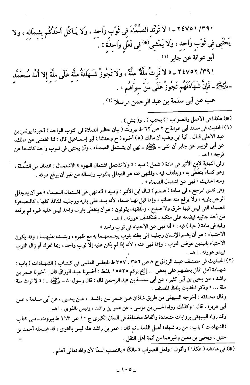 390/ 24751 - "لا تَرْتَدِ الصَمَّاءَ فِي ثَوْبٍ وَاحِدٍ، وَلا يَأكُل أحَدُكُم بِشِمَالِه، ولا يَحْتَبِي فِي ثَوْبٍ وَاحِدٍ، وَلا يَمْشِي (*) فِي نَعْلٍ وَاحِدَةٍ".