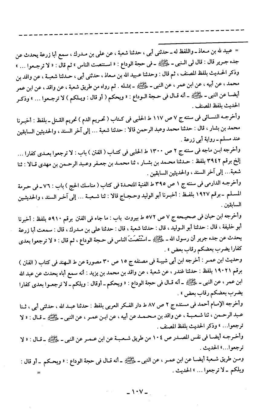 = عبيد الله بن معاذ -واللفظ له- حدثني أبي، حدثنا شعبة، عن علي بن مدرك، سمع أبا زرعة يحدث عن جده جرير قال: قال لي النبي - صلى الله عليه وسلم - في حجة الوداع: "استنصت الناس" ثم قال: "لا ترجعوا ... " وذكر الحديث بلفظ المصنف، ثم قال: وحدثنا عبيد الله بن معاذ، حدثني أبي، حدثنا شعبة، عن واقد بن محمد، عن أبيه، عن ابن عمر، عن النبي - صلى الله عليه وسلم - بمثله. ثم رواه من طريق شعبة، عن واقد، عن ابن عمر أيضًا عن النبي - صلى الله عليه وسلم - أنه قال في حجة الوداع: "ويحكم (أو قال: ويلكم) لا ترجعوا ... " وذكر الحديث بلفظ المصنف.