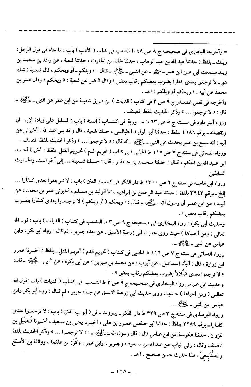 ورواه ابن ماجه في سننه ج 2 ص 1300 ط دار الفكر في كتاب (الفتن) باب: لا ترجعوا بعدى كفارا ... إلخ- برقم 3943 بلفظ: حدثنا عبد الرحمن بن إبراهيم، ثنا الوليد بن مسلم، أخبرني عمر بن محمد، عن أبيه، عن ابن عمر أن رسول الله - صلى الله عليه وسلم - قال: "ويحكم (أو ويلكم) لا ترجعوا بعدى كفارا بضرب بعضكم رقاب بعض".