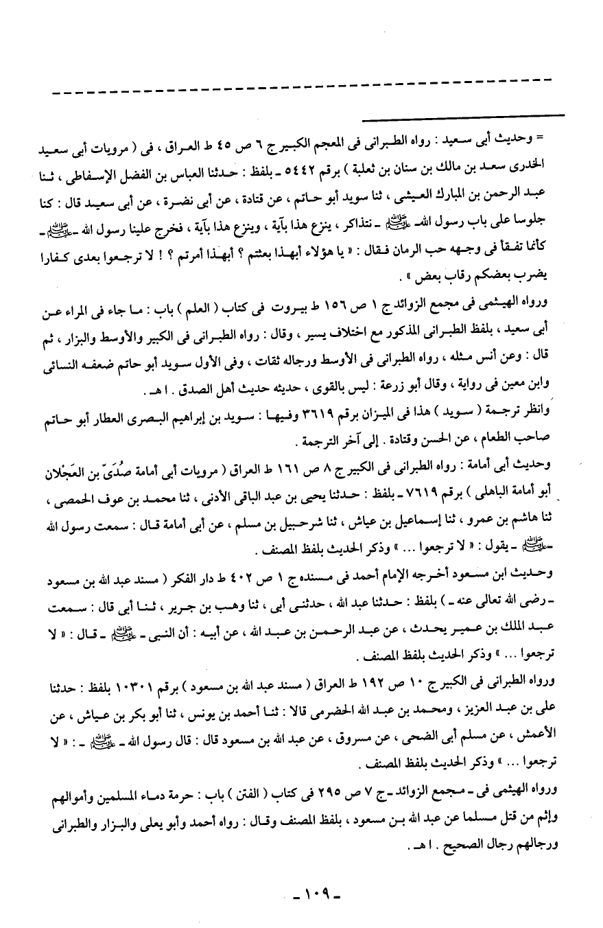 = وحديث أبي سعيد: رواه الطبراني في المعجم الكبير ج 6 ص 45 ط العراق، في (مروبات أبي سعيد الخدري سعد بن مالك بن سنان بن ثعلبة) برقم 5442 - بلفظ: حدثنا العباس بن الفضل الإسفاطى، ثنا عبد الرحمن بن المبارك العيشى، ثنا سويد أبو حاتم، عن قتادة، عن أبي نضرة، عن أبي سيد قال: كنا جلوسا على باب رسول الله - صلى الله عليه وسلم - نتذاكر، ينزع هذا بآية، وينزع هذا بآية، فخرج علينا رسول الله - صلى الله عليه وسلم - كأنما تفقأ في وجهه حب الرمان فقال: "يا هؤلاء أبهذا بعثتم؟ أبهذا أمرتم؟ ! لا ترجعوا بعدى كفارا يضرب بعضكم رقاب بعض".