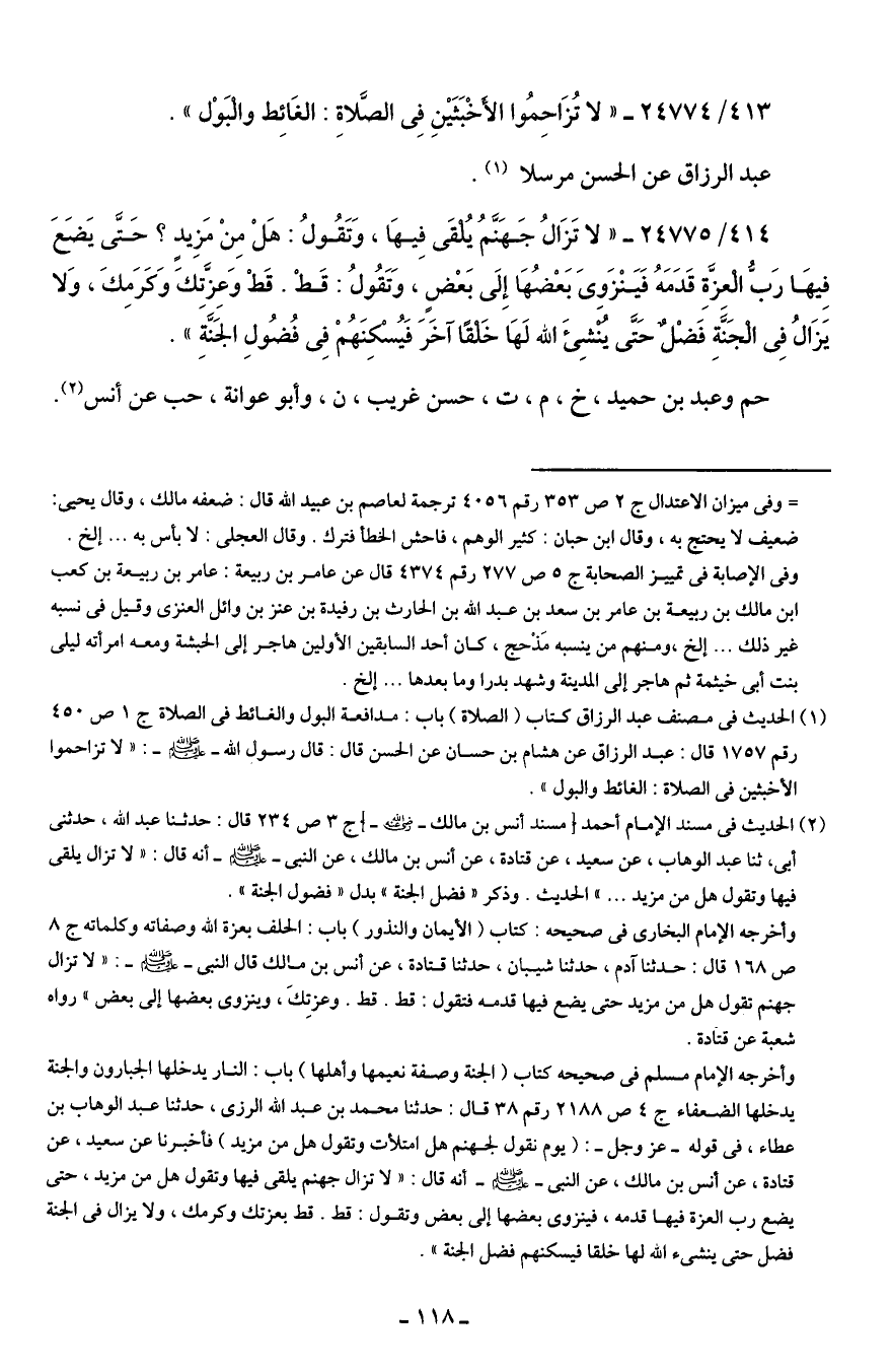 (¬2) الحديث في مسند الإمام أحمد {سند أنس بن مالك - رضي الله عنه -} ج 3 ص 234 قال: حدثنا عبد الله، حدثني أبي، ثنا عبد الوهاب، عن سعيد، عن قتادة، عن أنس بن مالك، عن النبي - صلى الله عليه وسلم - أنه قال: "لا تزال يلقى فيها وتقول هل من مزيد ... " الحديث. وذكر "فضل الجنة" بدل "فضول الجنة".