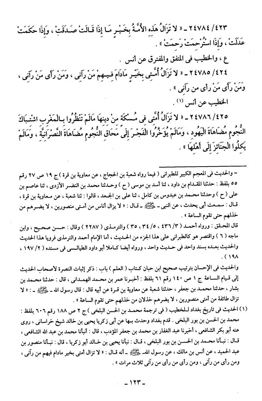 425/ 24786 - "لا تَزَالُ أُمَّتِي فِي مُسكة مِنْ دِينِهَا مَا لمْ تَنْظُرُوا بِالمَغْرِبِ اشْتِبَاكَ النُّجُوم مُضَاهَاةَ اليَهُودِ، وَمَا لمْ يُؤَخّرُوا الفَجْرَ إِلَى مَحَاقِ النُّجُوم مُضَاهَاةَ النَّصْرَانيَّة، وَمَا لمْ يَكِلُوا الجَنَائِزَ إِلَى أَهْلِهَا".