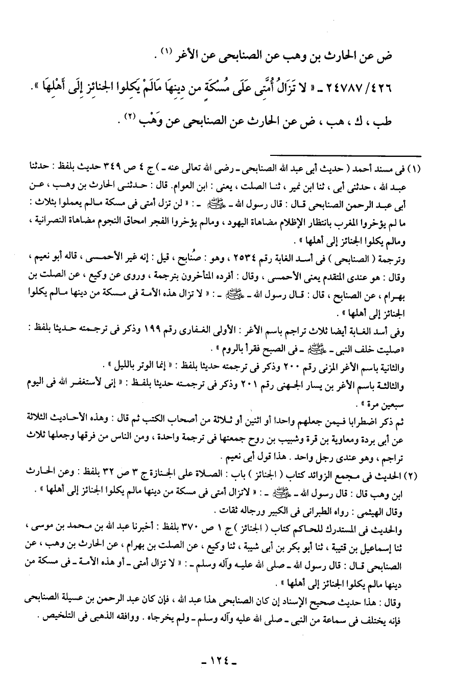 (¬1) في مسند أحمد (حديث أبي عبد الله الصنابحى -رضي الله تعالى عنه-) ج 4 ص 349 حديث بلفظ: حدثنا عبد الله، حدثني أبي، ثنا ابن نمير، ثنا الصلت، يعني: ابن العوام. قال: حدثني الحارث بن وهب، عن أبي عبد الرحمن الصنابحى قال: قال رسول الله - صلى الله عليه وسلم -: "لن تزل أمتي في مسكة ما لم يعملوا بثلاث: ما لم يؤخروا المغرب بانتظار الإظلام مضاهاة اليهود، وما لم يؤخروا الفجر امحاق النجوم مضاهاة النصرانية، وما لم يكلوا الجنائز إلى أهلها".