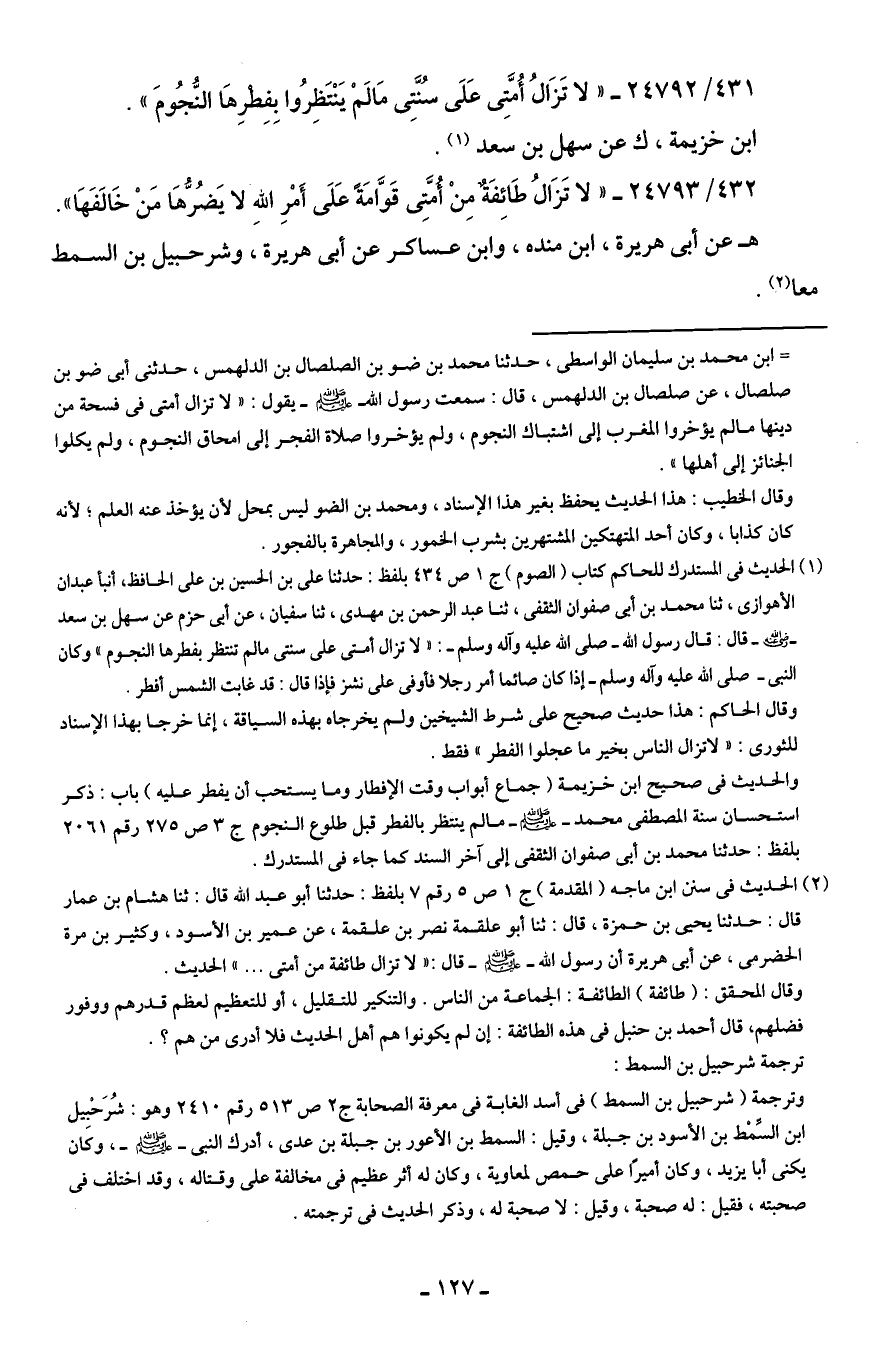 431/ 24792 - "لا تَزَالُ أُمَّتِي عَلَى سُنَّتِي مَا لمْ يَنْتَظِرُوا بِفِطرِهَا النُّجُومَ".