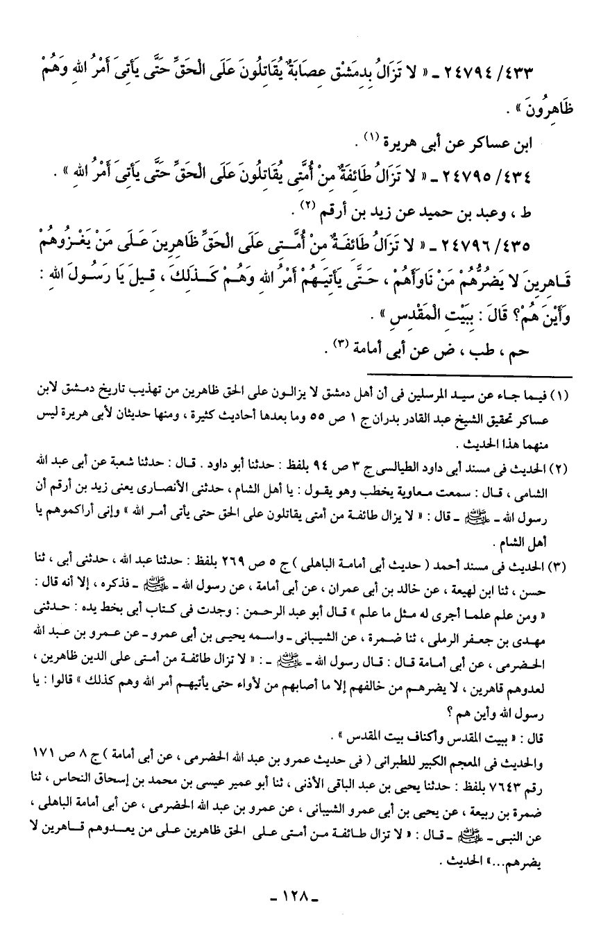 (¬1) فيما جاء عن سيد المرسلين في أن أهل دمشق لا يزالون على الحق ظاهرين من تهذيب تاريخ دمشق لابن عساكر تحقيق الشيخ عبد القادر بدران ج 1 ص 55 وما بعدها أحاديث كثيرة، ومنها حديثان لأبي هريرة ليس منهما هذا الحديث.
