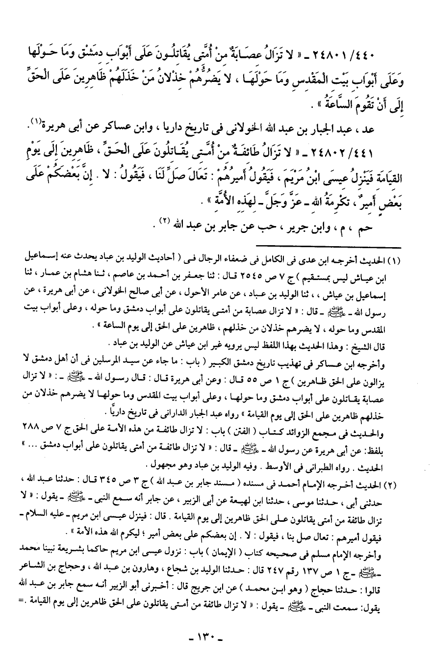 440/ 24801 - "لا تَزَالُ عِصَابَةٌ مِنْ أُمَّتِي يُقَاتِلُون عَلَى أَبْوَابِ دِمَشْق وَمَا حَوْلَها وَعَلَى أَبْوَابِ بَيتِ المَقْدِسِ وَمَا حَولَهَا، لا يَضُرُّهُمْ خِذْلانُ مَنْ خَذَلَهُمْ ظَاهِرِينَ عَلَى الحَقِّ إِلَى أَنْ تَقُومَ السَّاعَةُ".