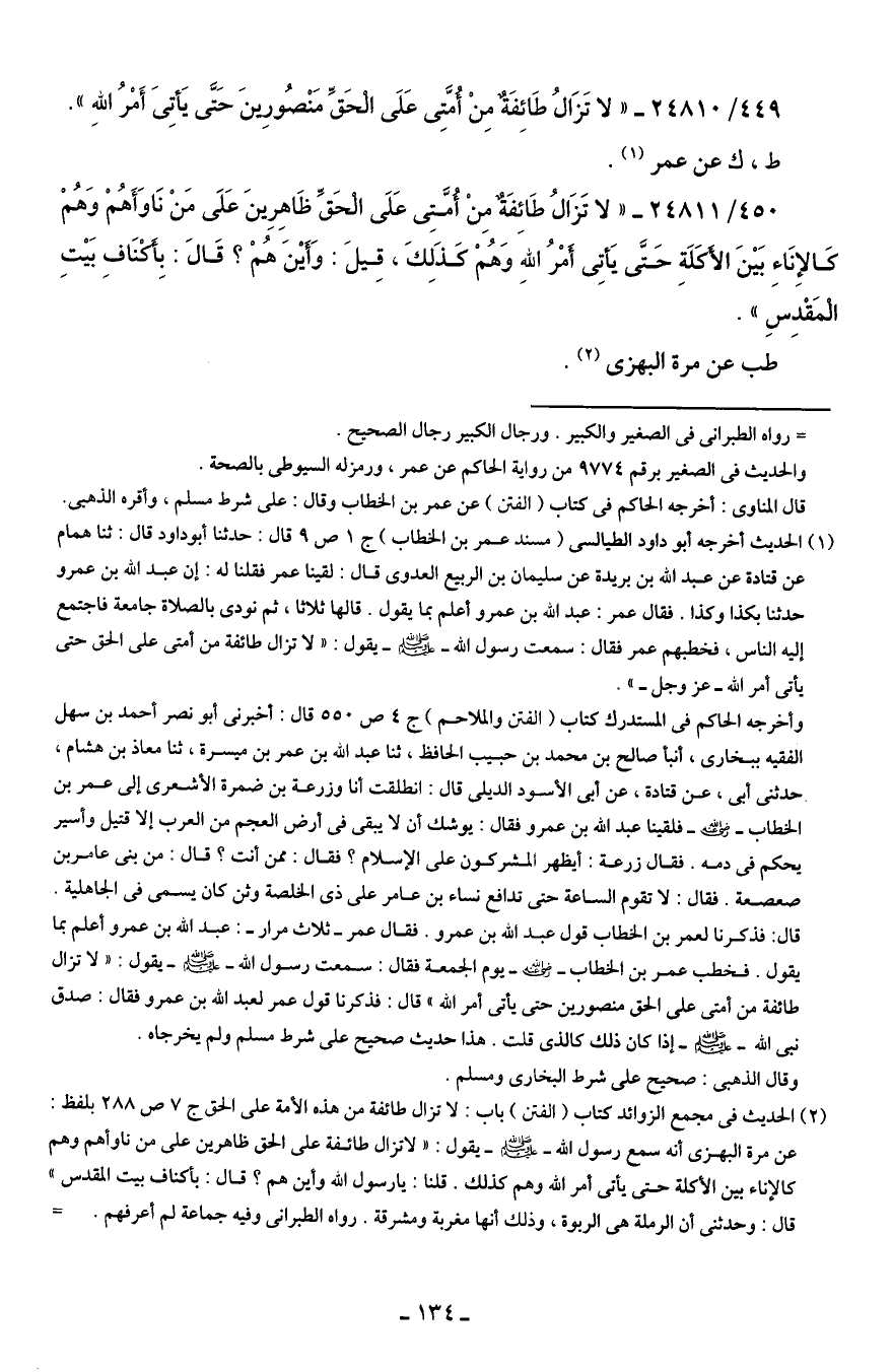 449/ 24810 - "لا تَزَالُ طَائِفَةٌ مِنْ أُمَّتِي عَلَى الحَقِّ مَنْصُورِينَ حَتَّى يَأتِيَ أَمْرُ اللهِ".