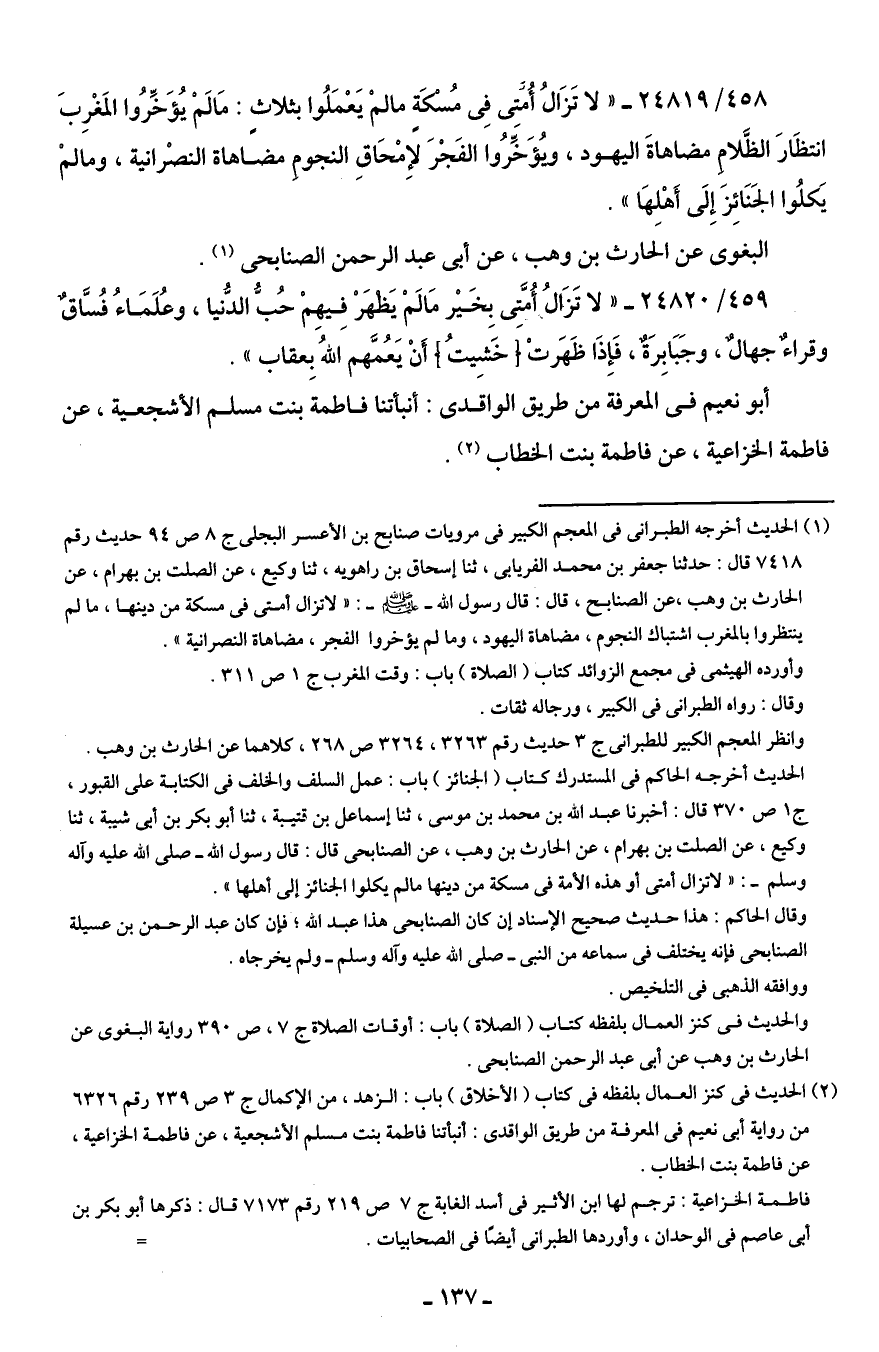 458/ 24819 - "لا تَزَالُ أُمَّتي فِي مُسكةٍ ما لمْ يَعْمَلُوا بثلاث: مَا لمْ يُؤَخِّرُوا المَغْرِبَ انتظَارَ الظَّلامِ مضاهاةَ اليهود، ويُؤَخِّرُوا الفَجْرَ لإِمْحَاقِ النجومِ مضاهاة النصْرانية، وما لمْ يَكلُوا الجَنَائِزَ إِلَى أَهْلِهَا".