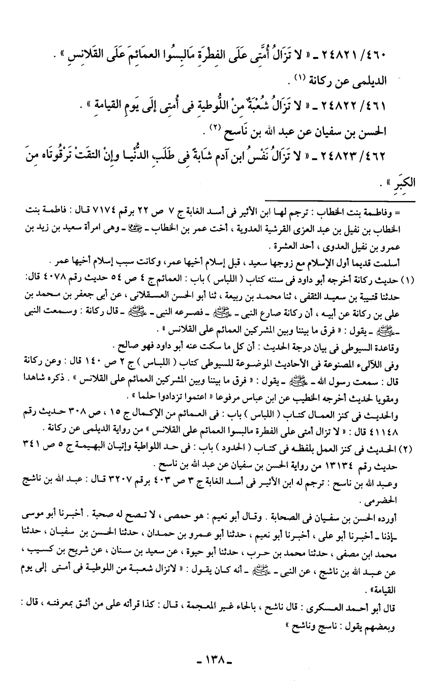460/ 24821 - "لا تَزَالُ أُمَّتِي عَلَى الفِطرَةِ مَا لبِسُوا العمَائِمَ عَلَى القَلانِسِ".