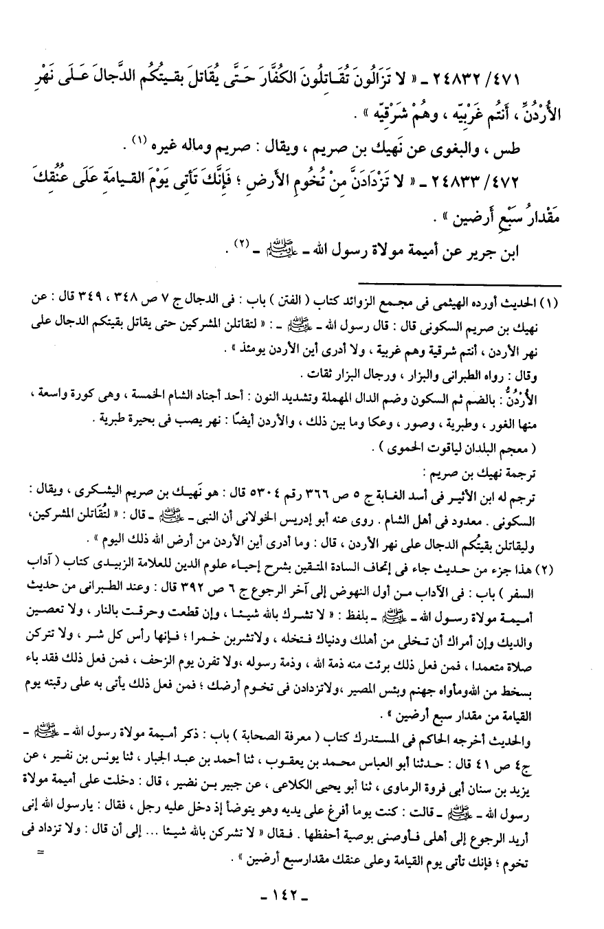 471/ 24832 - "لا تَزَالُونَ تُقَاتِلُونَ الكُفَّارَ حَتَّى يُقَاتلَ بقيتُكُم الدَّجال عَلَى نَهْرِ الأرْدُنِّ، أَنتُم غَرْبِيّه، وهُمْ شَرْقِيّه".
