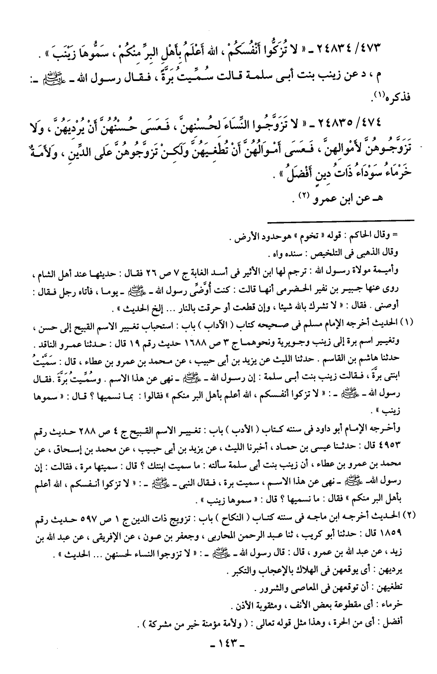 473/ 24834 - "لا تُزَكُّوا أَنْفُسَكُمْ، الله أَعْلَمُ بِأهْلِ البِرِّ مِنكمْ، سَمُّوهَا زَينَبَ".