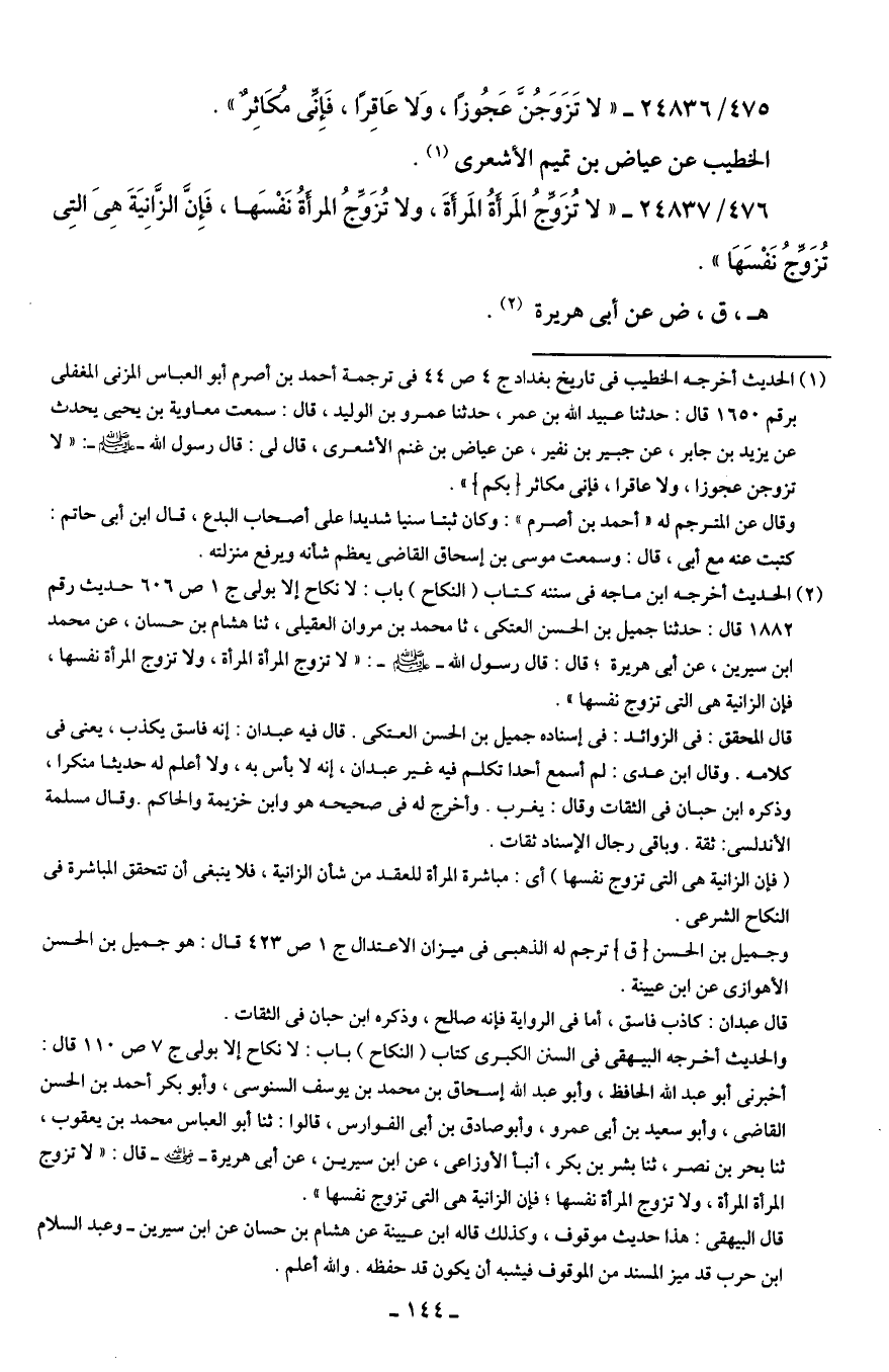 476/ 24837 - "لا تُزَوِّجُ المَرأةُ المَرأةَ، ولا تُزَوِّجُ المرأةُ نَفْسَها، فَإِنَّ الزَّانِيَةَ هِيَ التي تُزَوِّجُ نَفْسَهَا".