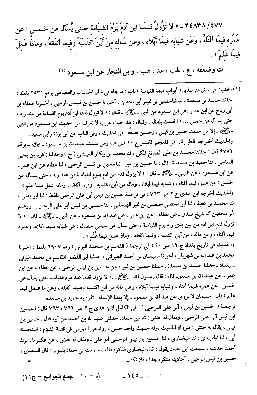 (¬1) الحديث في سنن الترمذي (أبواب صفة القيامة) باب: ما جاء في شأن الحساب والقصاص برقم 2531 بلفظ: حدثنا حميد بن مسعدة، حدثنا حصين بن نمير أبو محصن، أخبرنا حسين بن قيس الرحبى، أخبرنا عطاء بن أبي رباح عن ابن عمر، عن ابن مسعود عن النبي - صلى الله عليه وسلم - قال: "لا تزول قدما ابن آدم يوم القيامة من عند ربه، حتى يسأل عن خمس ... " الحديث بلفظه، وقال: هذا حديث غريب لا نعرفه من حديث ابن مسعود عن النبي - صلى الله عليه وسلم - إلا من حديث حسين بن قيس، وحسين يضعف في الحديث، وفي الباب عن أبي برزة وأبي سعيد. والحديث أخرجه الطبراني في المعجم الكبير ج 10 ص 8، ومن مسند عبد الله بن مسعود - رضي الله عنه - برقم 9772 قال: حدثنا محمد بن علي الصائغ المكي، ثنا محمد بن بيكار العيشى (ح) وحدثنا زكريا بن يحيى الساجى، ثنا حميد بن مسعدة. قال: ثنا حسين بن نمير. ثنا حسين بن قيس الرحبى، ثنا عطاء عن ابن عمر، عن ابن مسعود، عن النبي - صلى الله عليه وسلم - قال: "لا يزول قدم ابن آدم يوم القيامة من عند ربه، حتى يسأل عن خمس: عن عمره فيما أفناه، وشبابه فيما أبلاه، وماله من أين اكتسبه. وفيما أنفقه، وماذا عمل فيما علم".