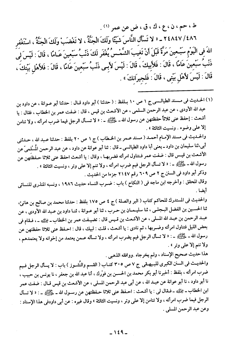 والحديث في مسند الإمام أحمد (مسند عمر بن الخطاب) ج 1 ص 20 بلفظ: حدثنا عبد الله، حدثني أبي، ثنا سليمان بن داود -يعني أبا داود الطيالسي- قال: ثنا أبو عوانة عن داود، عن عبد الرحمن المُسْلِمى عن الأشعث بن قيس قال: ضفت عمر فتناول امرأته فضربها، وقال: يا أشعث احفظ عنى ثلاثا حفظتَهن عن رسول الله - صلى الله عليه وسلم -: "لا تسأل الرجل فيم ضرب امرأته، ولا تنم إلا على وتر، ونسيت الثالثة".