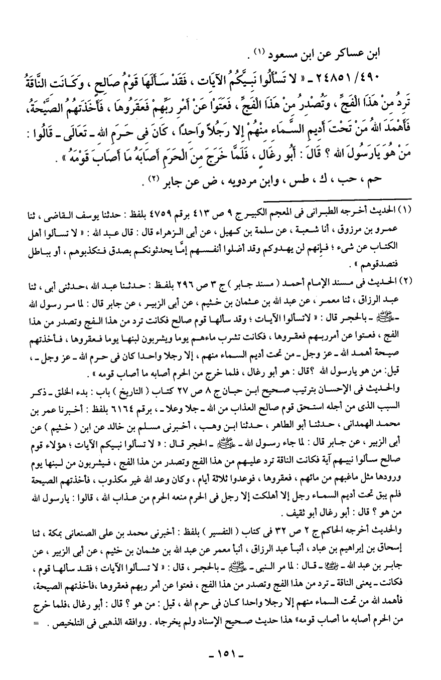 490/ 24851 - "لا تَسْألُوا نَبيَّكُمُ الآيَات، فَقَدْ سَألَهَا قَوْمُ صَالِحٍ، وَكَانَتِ النّاقَةُ تَرِدُ مِنْ هَذا الفَجِّ، وَتُصْدِرُ مِنْ هَذَا الفَجِّ، فَعَتَوْا عَنْ أَمْرِ ربِّهِمْ فَعَقَرُوهَا، فَأخذَتهُمُ الصَّيحَةُ، فَأهمَدَ اللهُ مَنْ تَحْت أدِيم السَّمَاءِ مِنْهُمْ إِلا رَجُلًا وَاحِدًا، كَانَ فِي حَرَمِ اللهِ -تعَالى- قَالُوا: مَنْ هُوَ يَا رَسُولَ الله؟ قَال: أَبُو رغَالٍ، فَلَمَّا خَرج مِنَ الحَرَم أصَابَهُ مَا أصَابَ قَوْمَهُ".