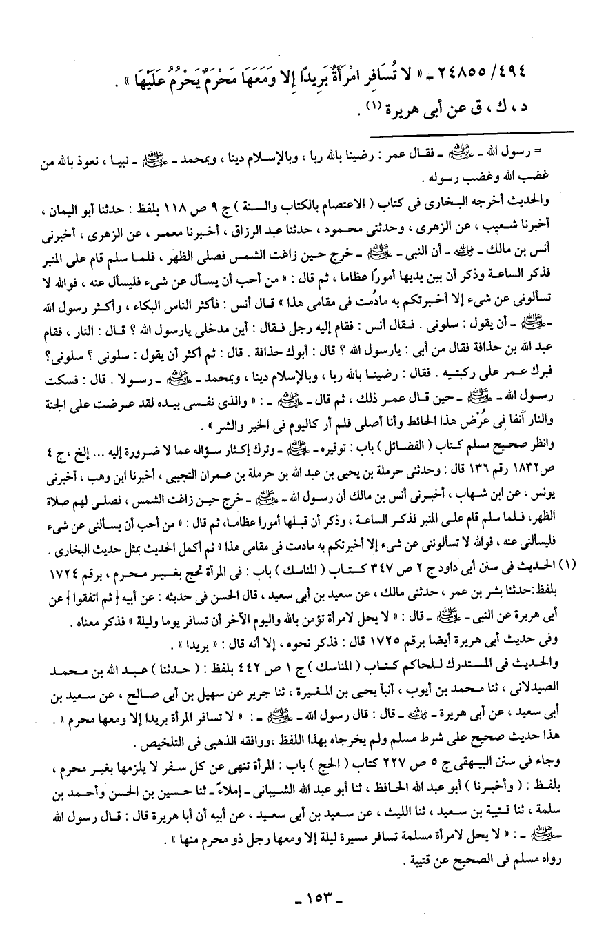 494/ 24855 - "لا تُسَافِر امْرَأةٌ بَرِيدًا إِلا وَمَعَهَا مَحْرَمٌ يَحْرُمُ عَلَيهَا".