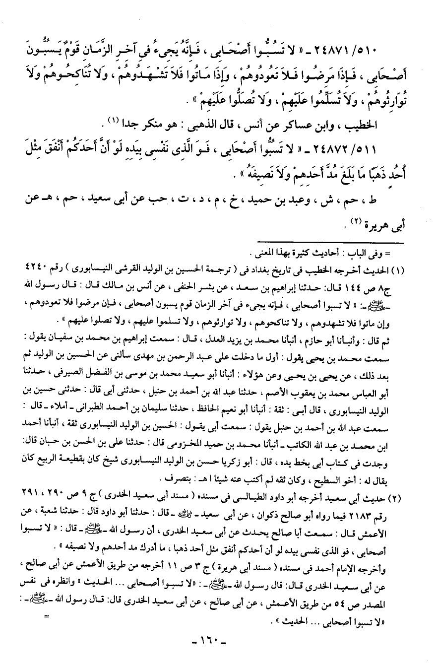 (¬2) حديث أبي سعيد أخرجه أبو داود الطيالسي في مسنده (مسند أبي سعيد الخدري) ج 9 ص 290، 291 رقم 2183 فيما رواه أبو صالح ذكوان، عن أبي سعيد - رضي الله عنه - قال: حدثنا أبو داود قال: حدثنا شعبة، عن الأعمش قال: سمعت أبا صالح يحدث عن أبي سعيد الخدري، أن رسول الله - صلى الله عليه وسلم - قال: "لا تسبوا أصحابي، فوالذي نفسي بيده لو أن أحدكم أنفق مثل أحد ذهبا، ما أدرك مد أحدهم ولا نصيفه".