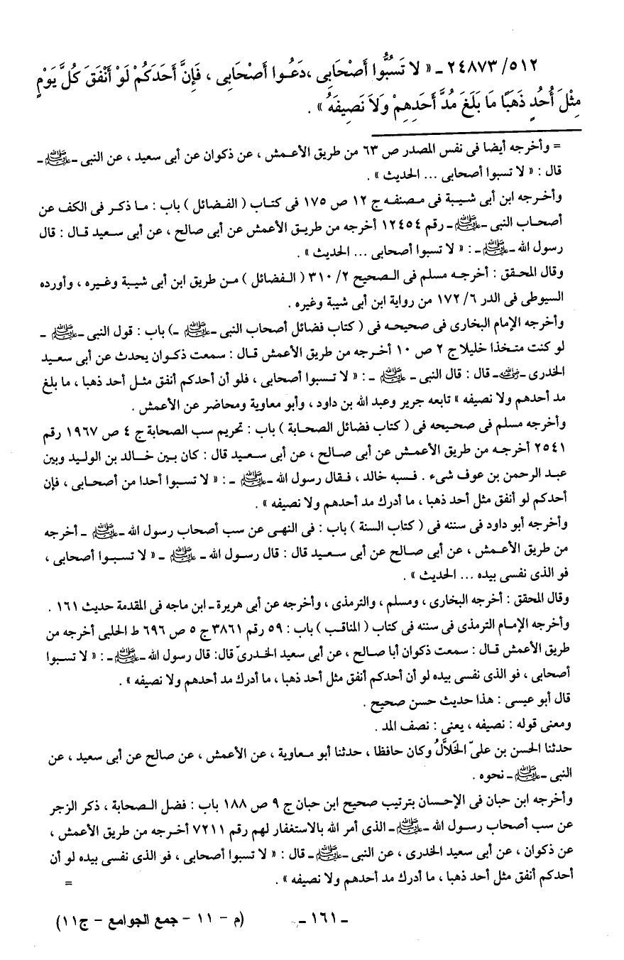 512/ 24873 - "لا تَسُبُّوا أَصْحَابِي، دَعُوا أَصْحَابِي، فَإِنَّ أَحَدَكُمْ لَوْ أَنْفَقَ كُلَّ يَوْمٍ مِثْلَ أُحُدٍ ذَهَبًا مَا بَلَغَ مُدَّ أَحَدِهِمْ وَلَا نَصِيفَهُ".