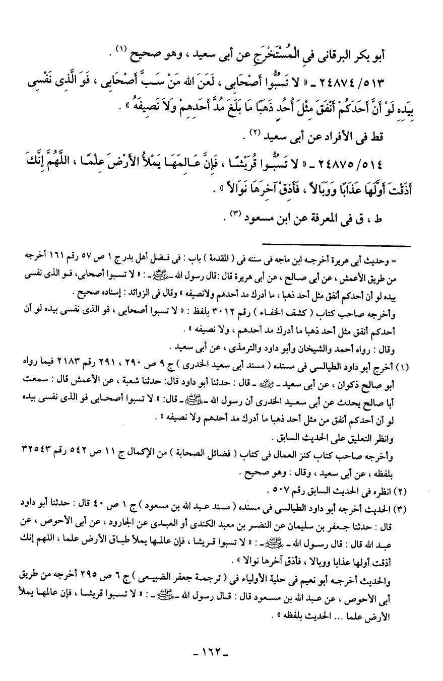 (¬1) أخرج أبو داود الطيالسي في مسنده (مسند أبي سعيد الخدري) ج 9 ص 290، 291 رقم 2183 فيما رواه أبو صالح ذكوان، عن أبي سعيد - رضي الله عنه - قال: حدثنا أبو داود قال: حدثنا شعبة، عن الأعمش قال: سمعت أبا صالح يحدث عن أبي سعيد الخدري أن رسول الله - صلى الله عليه وسلم - قال: "لا تسبوا أصحابي فوالذي نفسي بيده لو أن أحدكم أنفق من مثل أحد ذهبا ما أدرك مد أحدهم ولا نصيفه".