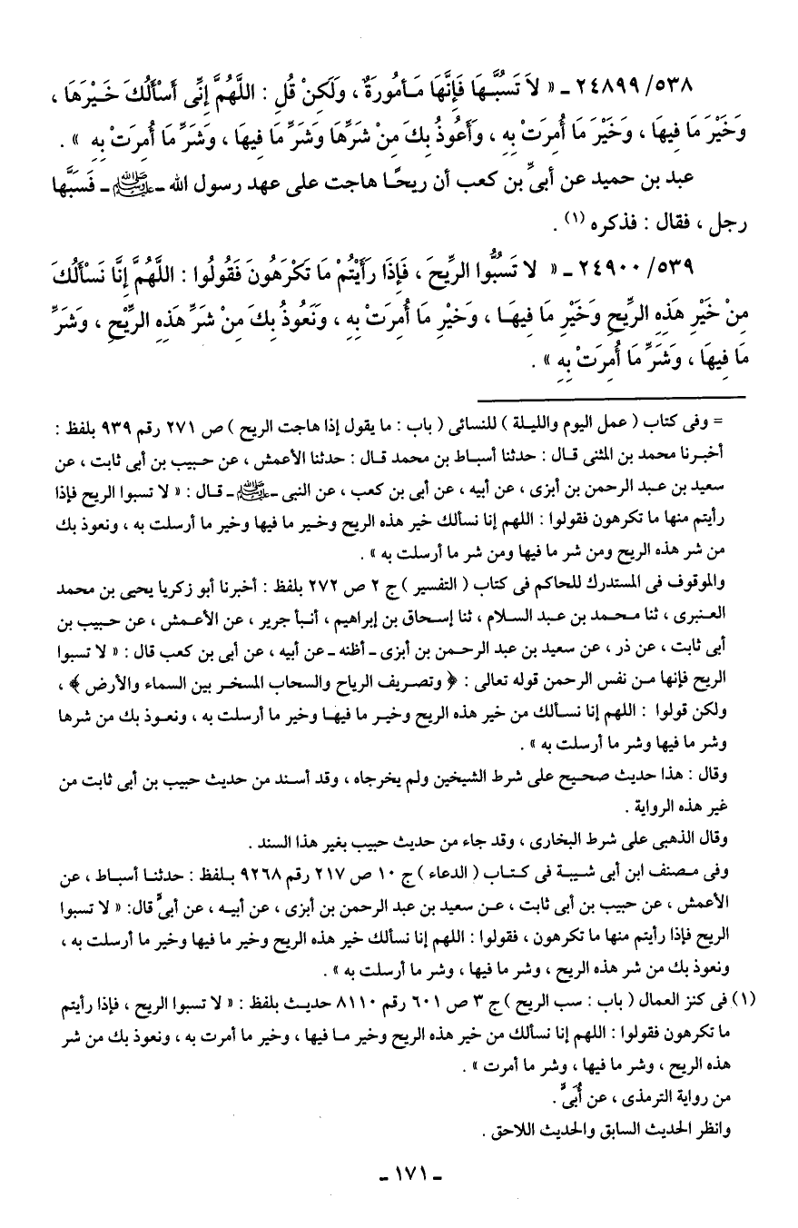539/ 24900 - "لا تَسُبُّوا الرِّيحَ، فَإِذَا رَأَيتُمْ مَا تَكْرَهُونَ فَقُولُوا: اللَّهُمَّ إِنَّا نَسْأَلُكَ مِنْ خَيرِ هَذِهِ الرِّيحِ وَخَيرِ مَا فِيهَا، وَخيرِ مَا أُمِرَتْ بِهِ، وَنَعُوذُ بِكَ مِنْ شَرِّ هَذِهِ الرِّيحِ، وَشَرِّ مَا فِيهَا، وَشَرِّ مَا أُمِرَتْ بِهِ".