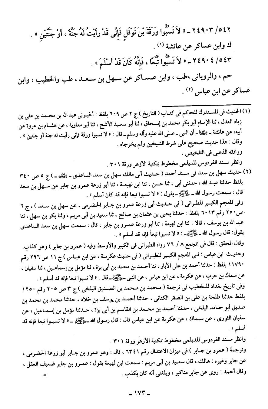 542/ 24903 - "لَا تَسُبُّوا وَرَقَةَ بْنَ نَوْفَلٍ فَإِنِّي قَدْ رأَيتُ لَهُ جَنَّةً، أَوْ جَنَّتَينِ".