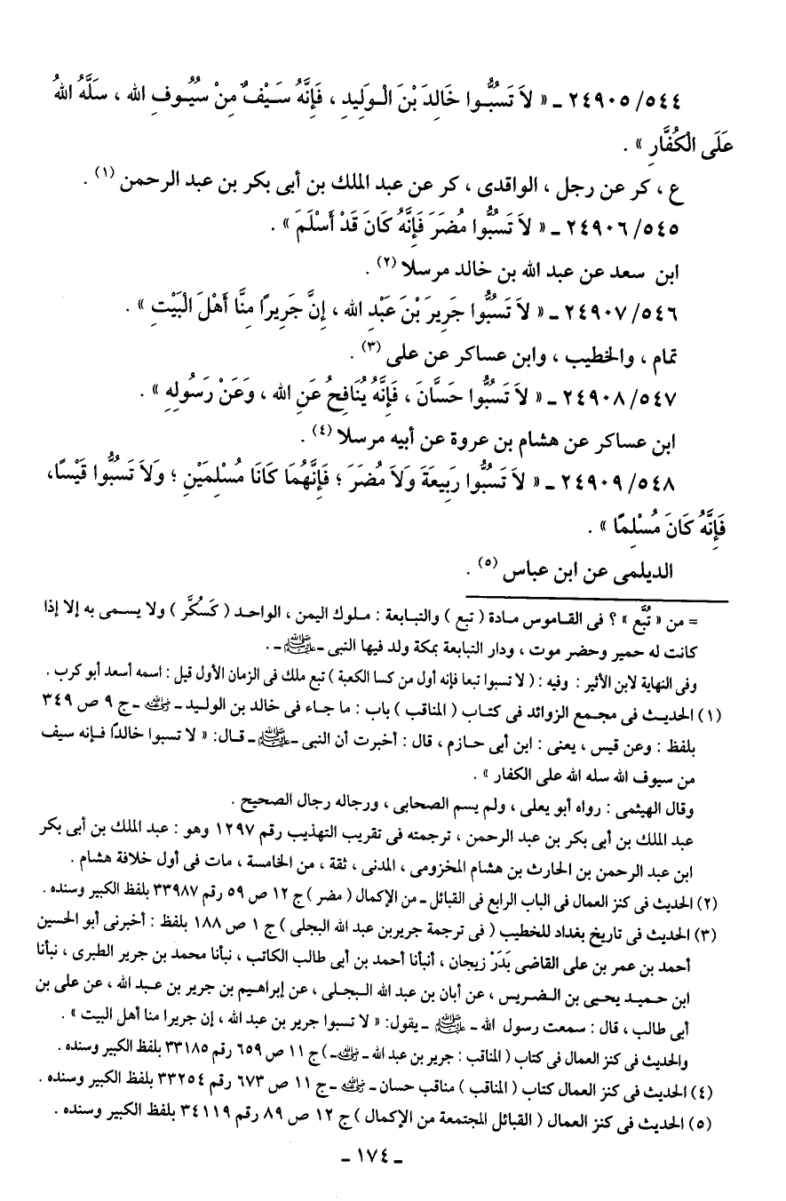 (¬5) الحديث في كنز العمال (القبائل المجتمعة من الإكمال) ج 12 ص 89 رقم 34119 بلفظ الكبير وسنده.