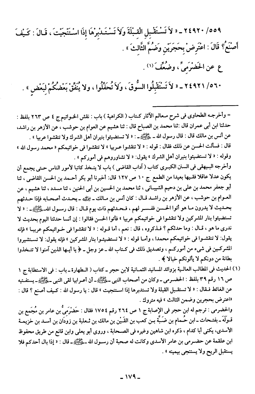 (¬1) الحديث في المطالب العالية بزوائد المسانيد الثمانية لابن حجر -كتاب (الطهارة -باب: في الاستطابة ج 1 ص 16 رقم 39 بلفظ: الحضرمي- وكان من أصحاب النبي - صلى الله عليه وسلم - أن أعرابيا لقى النبي - صلى الله عليه وسلم - يستفتيه عن الغائط فقال: "لا تستقبل القبلة ولا تستدبرها إذا استنجيت" قال: يا رسول الله: كيف أصنع؟ قال: "اعترض بحجرين وضمن الثالث" فيه متروك.