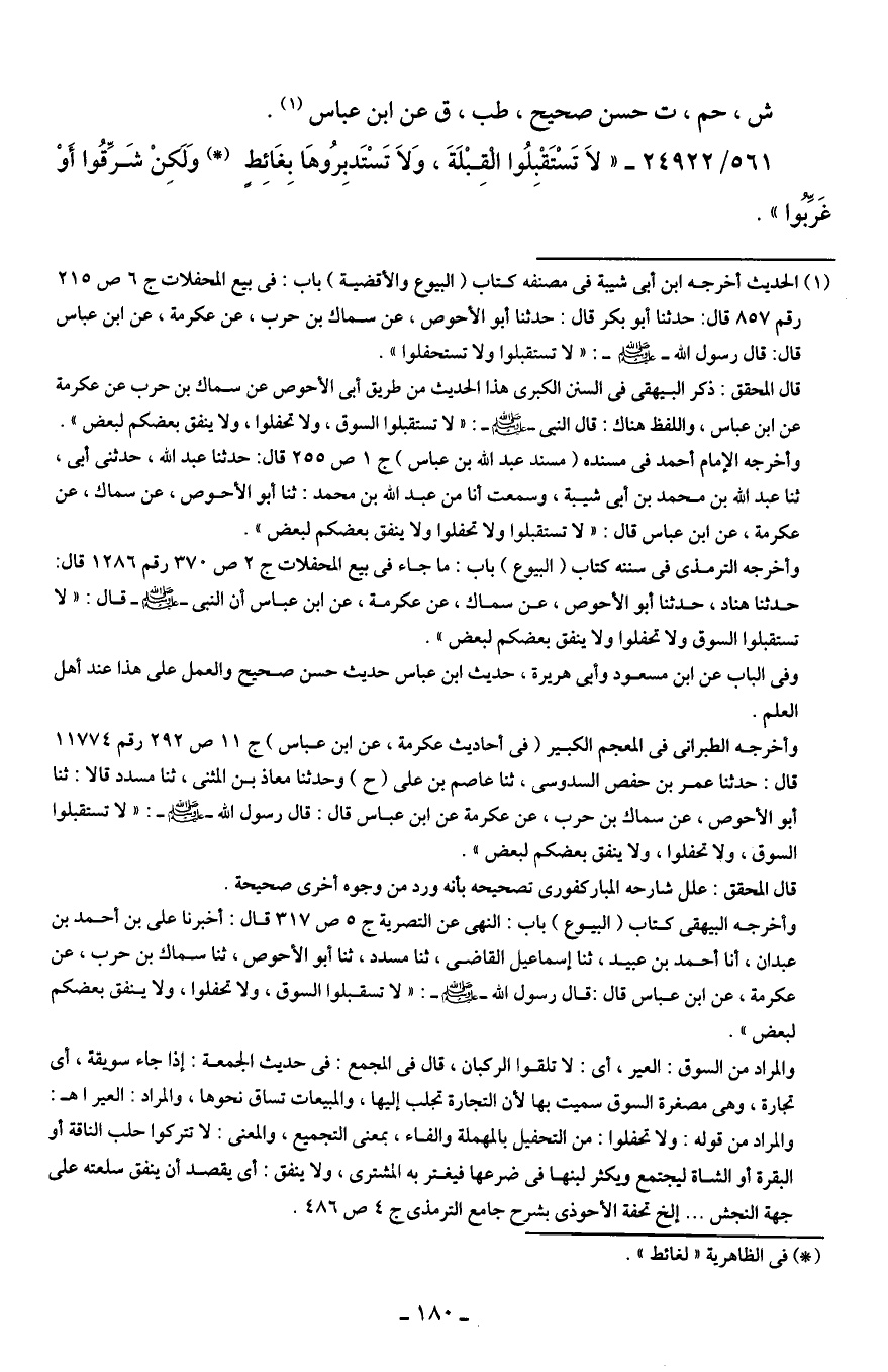 (¬1) الحديث أخرجه ابن أبي شيبة في مصنفه كتاب (البيوع والأقضية) باب: في بيع المحفلات ج 6 ص 215 رقم 857 قال: حدثنا أبو بكر قال: حدثنا أبو الأحوص، عن سماك بن حرب، عن عكرمة، عن ابن عباس قال: قال رسول الله - صلى الله عليه وسلم -: "لا تستقبلوا ولا تستحفلوا".