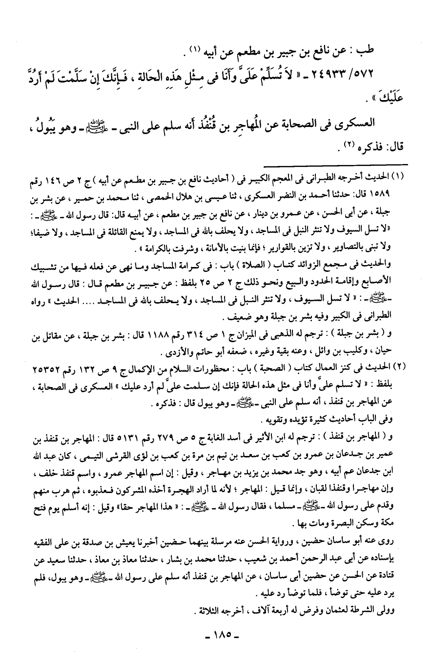 (¬2) الحديث في كنز العمال كتاب (الصحبة) باب: محظورات السلام من الإكمال ج 9 ص 132 رقم 25352 بلفظ: "لا تسلم عليَّ وأنا في مثل هذه الحالة فإنك إن سلمت عليَّ لم أرد عليك" العسكري في الصحابة، عن المهاجر بن قنفذ، أنه سلم على النبي - صلى الله عليه وسلم - وهو يبول قال: فذكره.