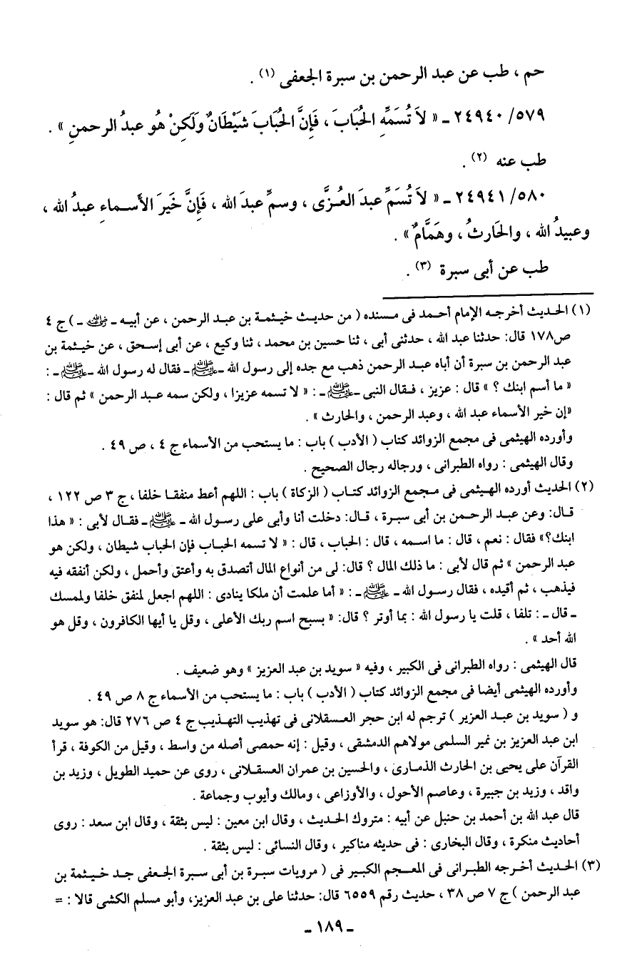 (¬1) الحديث أخرجه الإمام أحمد في مسنده (من حديث خيثمة بن عبد الرحمن، عن أبيه - رضي الله عنه -) ج 4 ص 178 قال: حدثنا عبد الله، حدثني أَبي، ثنا حسين بن محمد، ثنا وكيع، عن أبي إسحاق، عن خيثمة بن عبد الرحمن بن سبرة أن أباه عبد الرحمن ذهب مع جده إلى رسول الله - صلى الله عليه وسلم - فقال له رسول الله - صلى الله عليه وسلم -: "ما اسم ابنك؟ " قال: عزيز، فقال النبي - صلى الله عليه وسلم -: "لا تسمه عزيزا، ولكن سمه عبد الرحمن" ثم قال: "إن خير الأسماء عبد الله، وعبد الرحمن، والحارث".