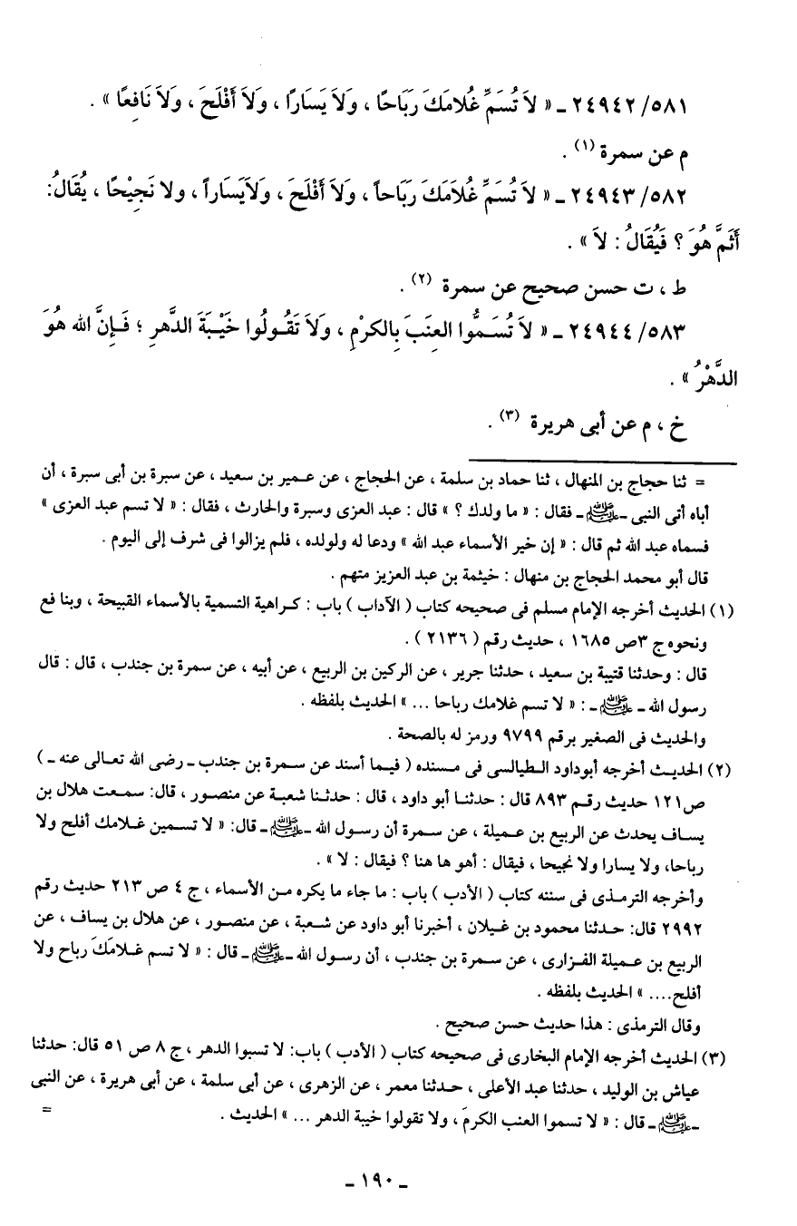 581/ 24942 - "لَا تُسَمِّ غُلامَكَ رَبَاحًا، وَلَا يَسَارًا، وَلَا أفْلَحَ، وَلَا نَافِعًا".