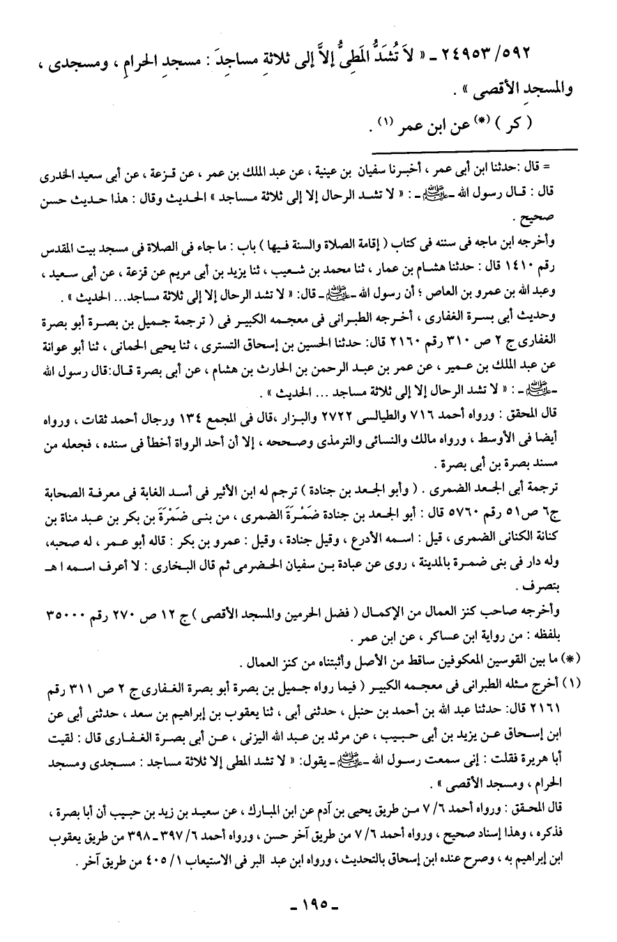 592/ 24953 - "لَا تُشَدُّ المَطِيُّ إلَّا إلى ثلاثةِ مساجِدَ: مسجدِ الحرامِ، ومسجدي، والمسجدِ الأقصى".